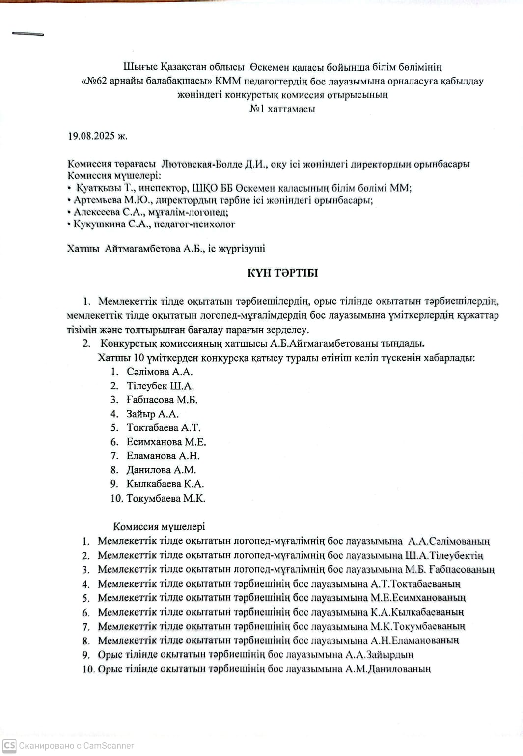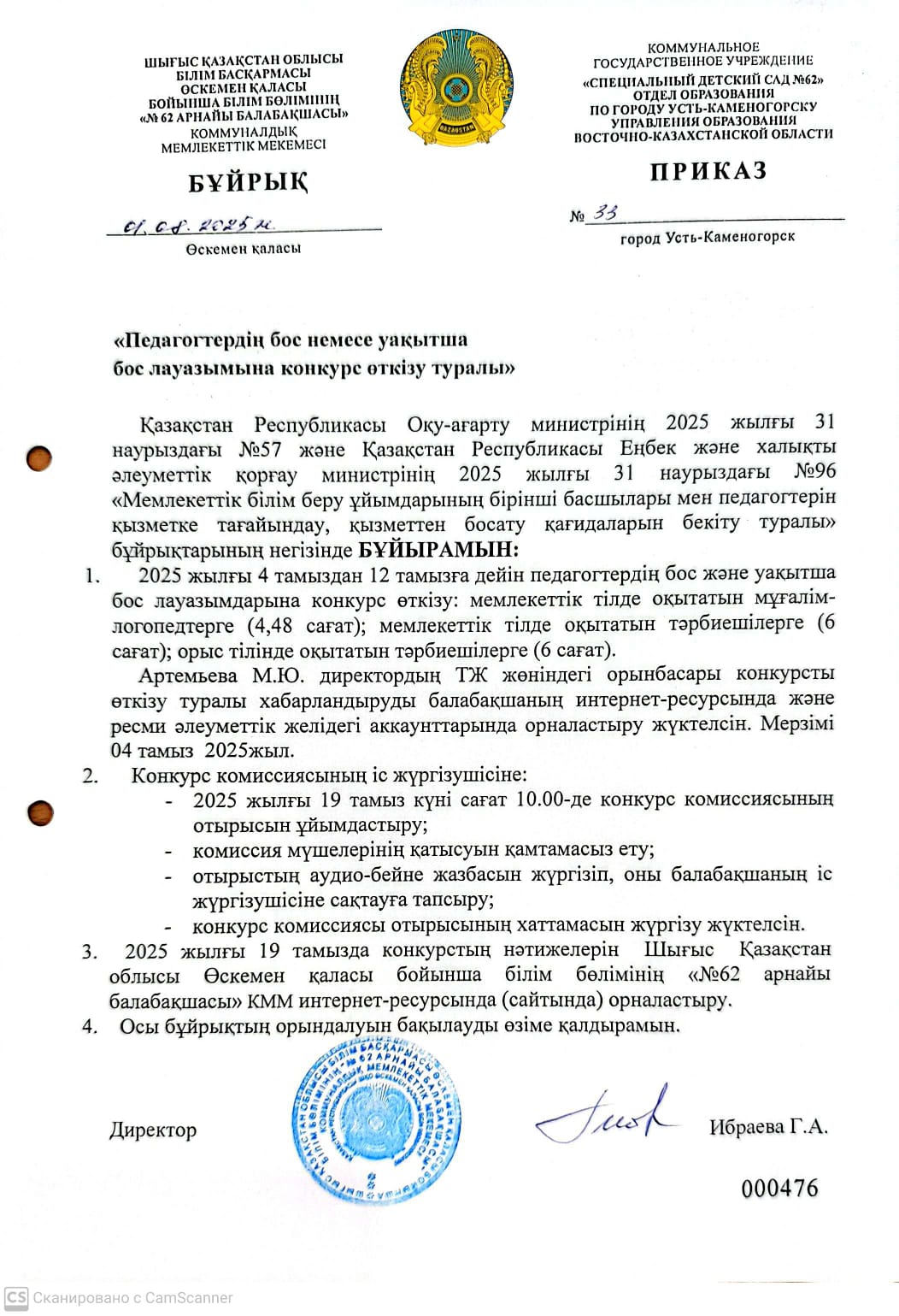 Өскемен қаласы әкімдігінің «Сөйлеу қабілеті бұзылған балаларға арналған № 62 балабақшасы» КММ директорының 2021 жылғы 22 қаңтардағы № 60 бұйрығымен ШҚО білім басқармасы Өскемен қаласы бойынша білім бөлімінің «Сөйлеу қабілеті бұзылған балаларға арналған № 62 балабақшасы» КММ директоры лауазымында жұмысын жалғастырушы болып есептелсін. Директор Ибраева Гульден Ахметкалиевна 2 жоғары білімі бар («Музыка және ән мұғалімі, әдіскер, тәрбиеші», ШҚМУ «Дефектология»), жұмыс өтілі 26 жыл, аталған мекемеде 6 жыл.