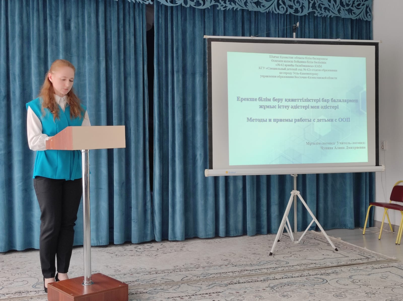 2024 жылдың 27 наурызында жылдық жұмыс жоспары аясында Шығыс Қазақстан облысы білім басқармасының Өскемен қаласы бойынша білім бөлімінің «№62 арнайы балабақшасы» КММ-де әдістемелік кеңес өтті. Тақырыбы: «Ерекше білім беру қажеттіліктері бар балалармен жұмыс жасаудағы педагогтардың қызметі (ерекше білім беру қажеттіліктері)