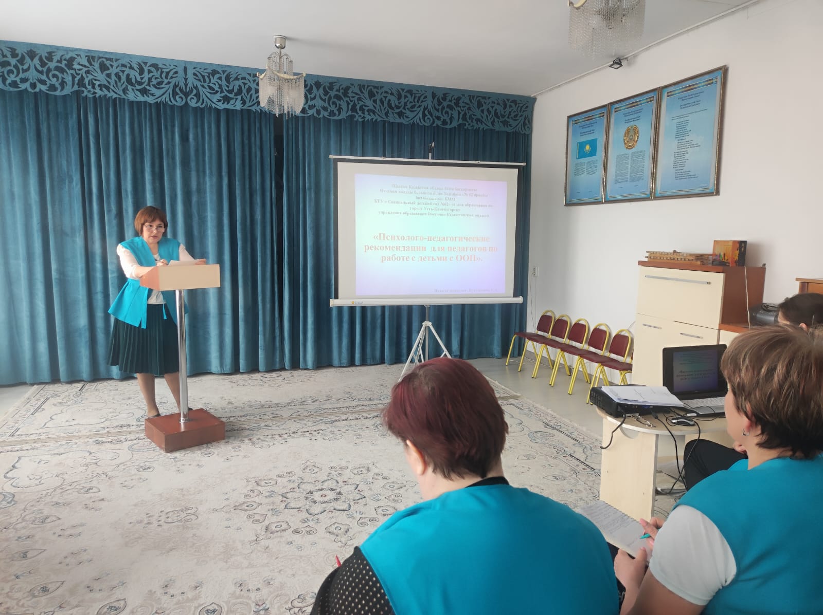 Педагог-психолог С.А.Кукушкина «Мүмкіндіктері шектеулі балалармен жұмыс жасау кезінде педагогтарға арналған психологиялық-педагогикалық ұсыныстар» тақырыбында баяндама жасады. Дамуында әртүрлі ауытқулары бар балалармен қарым-қатынас ерекшеліктеріне егжей-тегжейлі тоқталып, олардың танымдық, коммуникативті және әлеуметтік дағдыларын дамытуға бағытталған жұмыстың тиімді әдістерін қарастырды.