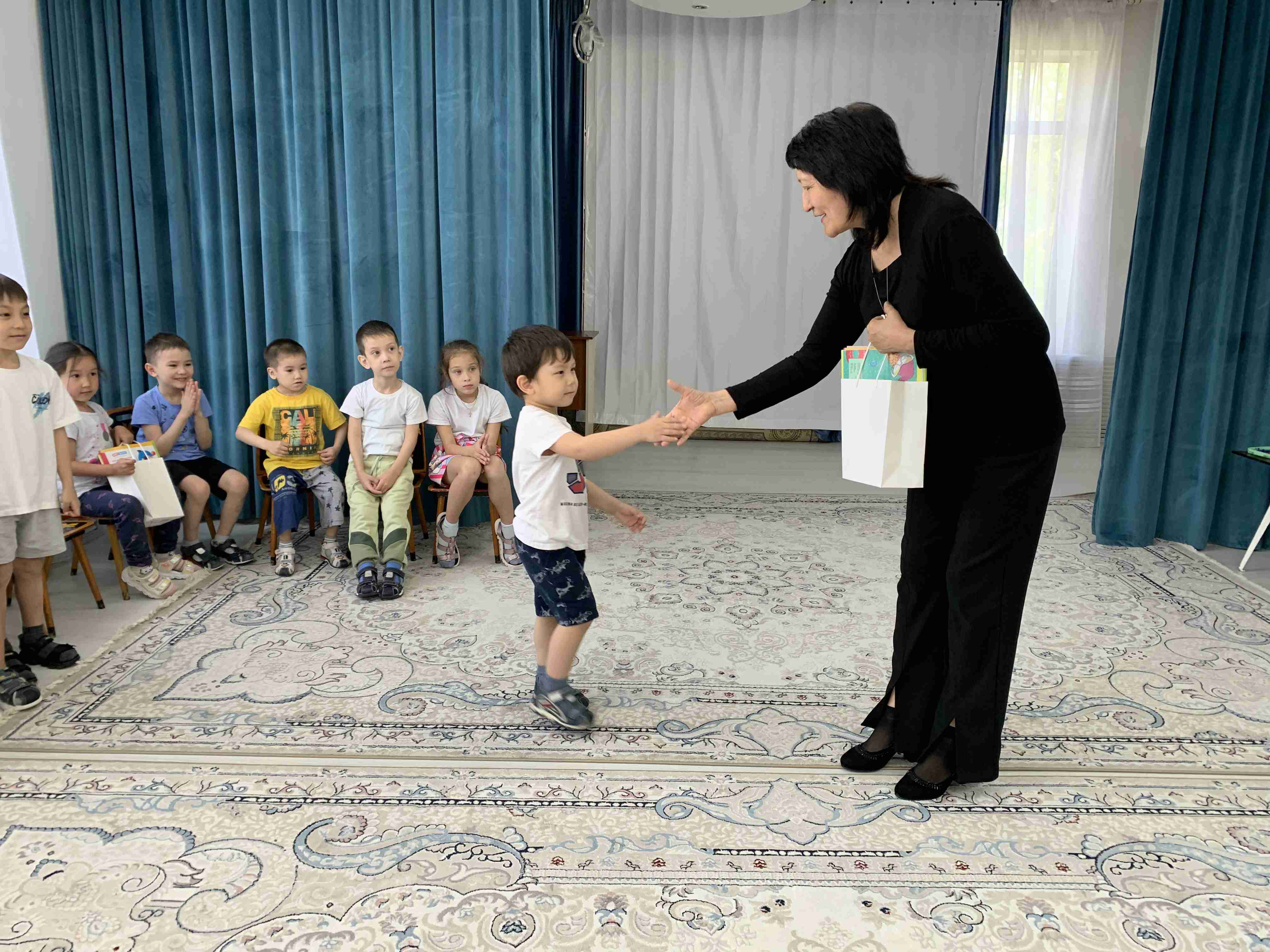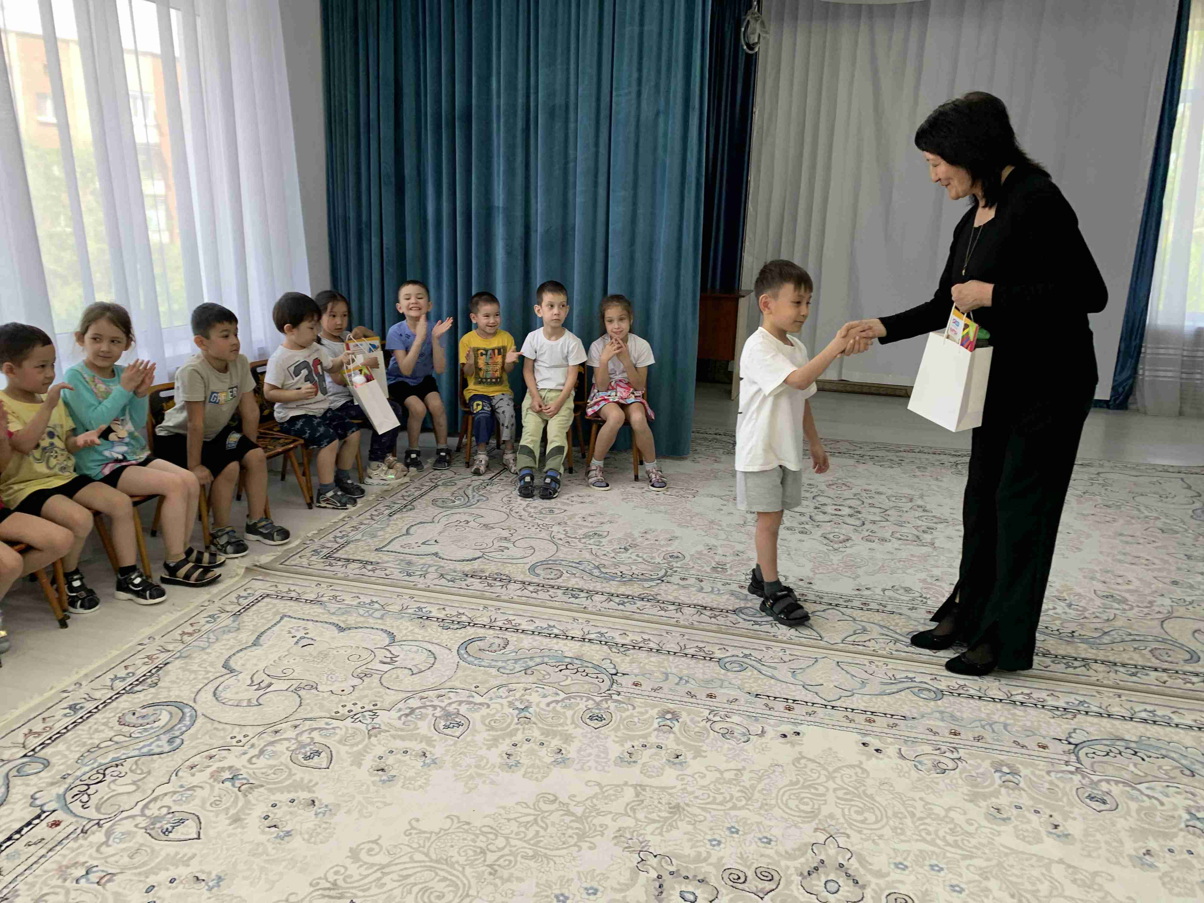 Біз тәрбиеленушілерімізге жазғы демалысы үшін шағын сыйлықтар бердік.