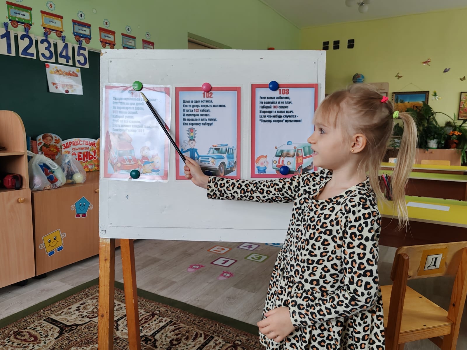 Үлкен және мектепалды даярлық топтарының тәрбиеленушілері қауіпсіздікті қамтамасыз ететін қалалық қызметтердің (өрт сөндіру бөлімі, полиция, медициналық көмек, авариялық-құтқару қызметі) негізгі телефон нөмірлерін жаттап алды. Балалар әр түрлі жазатайым оқиғалардың алдын алуға болатын жағдайларды және қиындық туындаған жағдайда қалай көмектесуге болатынын ойластырды.