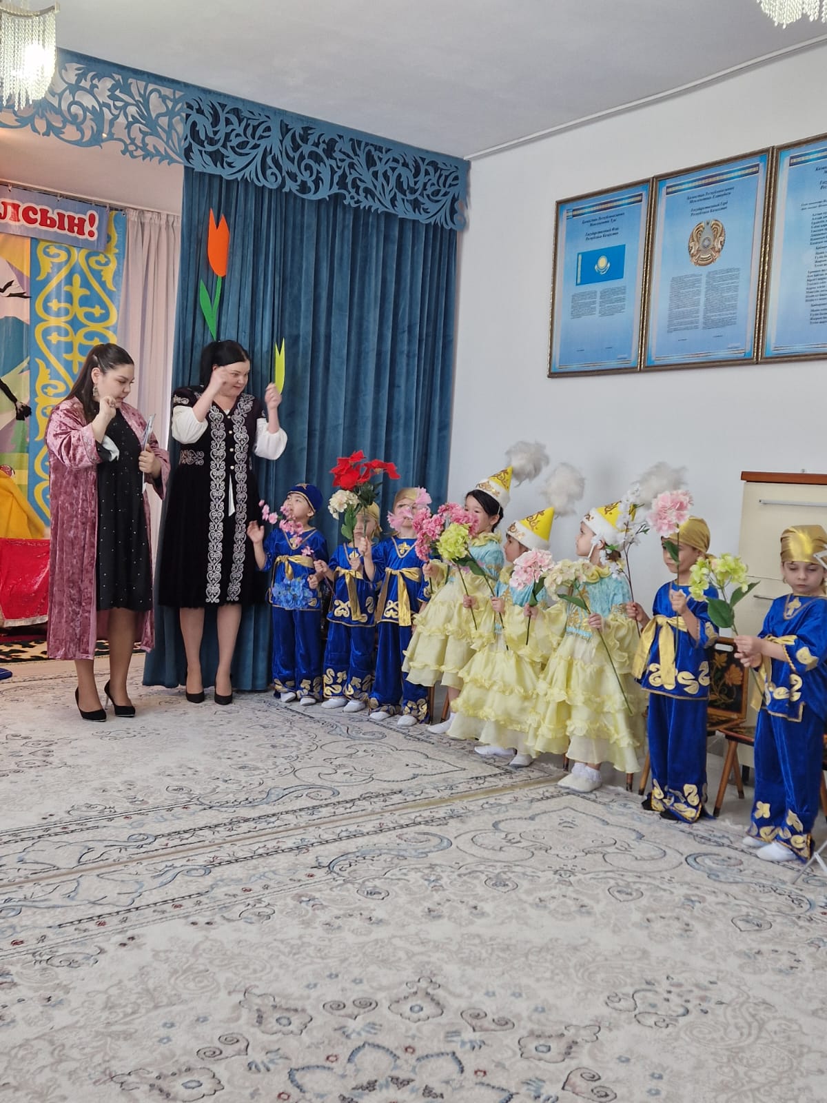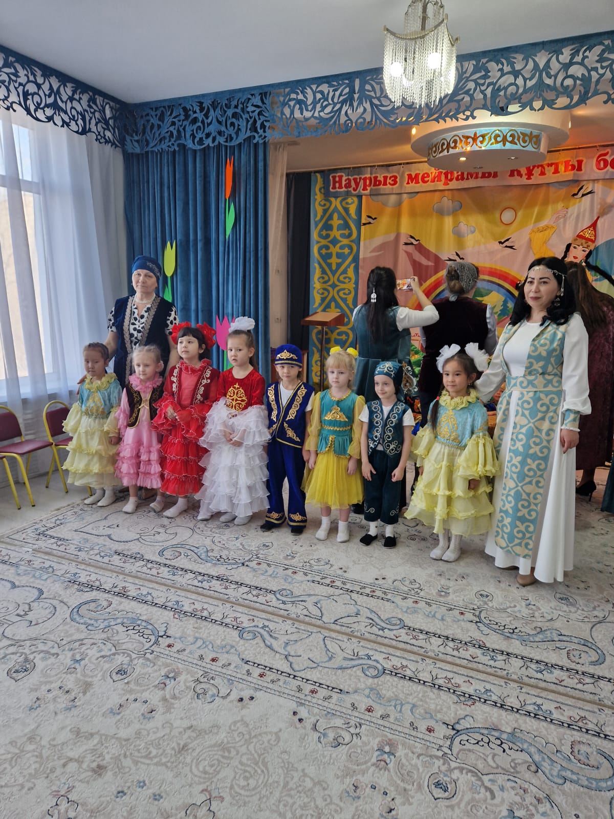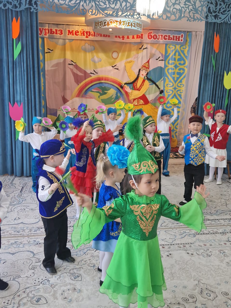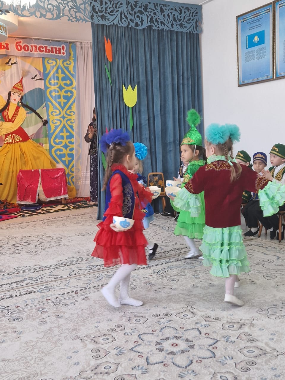 Наурыз-көктем, күн мен түннің теңелу, табиғаттың жаңару мерекесі. Наурыз-жыл басы. Шығыс елдері үшін Наурыз-бірлік, бейбітшілік, еңбек, көктем, жақсылық, бақыт мерекесі. Қазақ халқының дәстүріне сүйене отырып, іс-шарада тәрбиеленушілердің орындауындағы әндер, өлеңдер мен билер шырқалды. Барлық ережелерді сақтай отырып, «Шаш өру дәстүрі», «Бесікке салу» «Тұсау кесу» рәсімдері өткізілді. «Тенге алу», «Арқан тарту», «Гүл теру» ұлттық ойындары өткізілді. Наурыз мерекесі күндері іс-шарада дастархан жайылды, ол үйдегі байлық пен молшылықты бейнеледі. Дәстүрді сақтай отырып, іс-шарада Қыдыр ата батасы берілді. Аталған іс-шараға ата-аналар, балабақша қызметкерлері қатысты