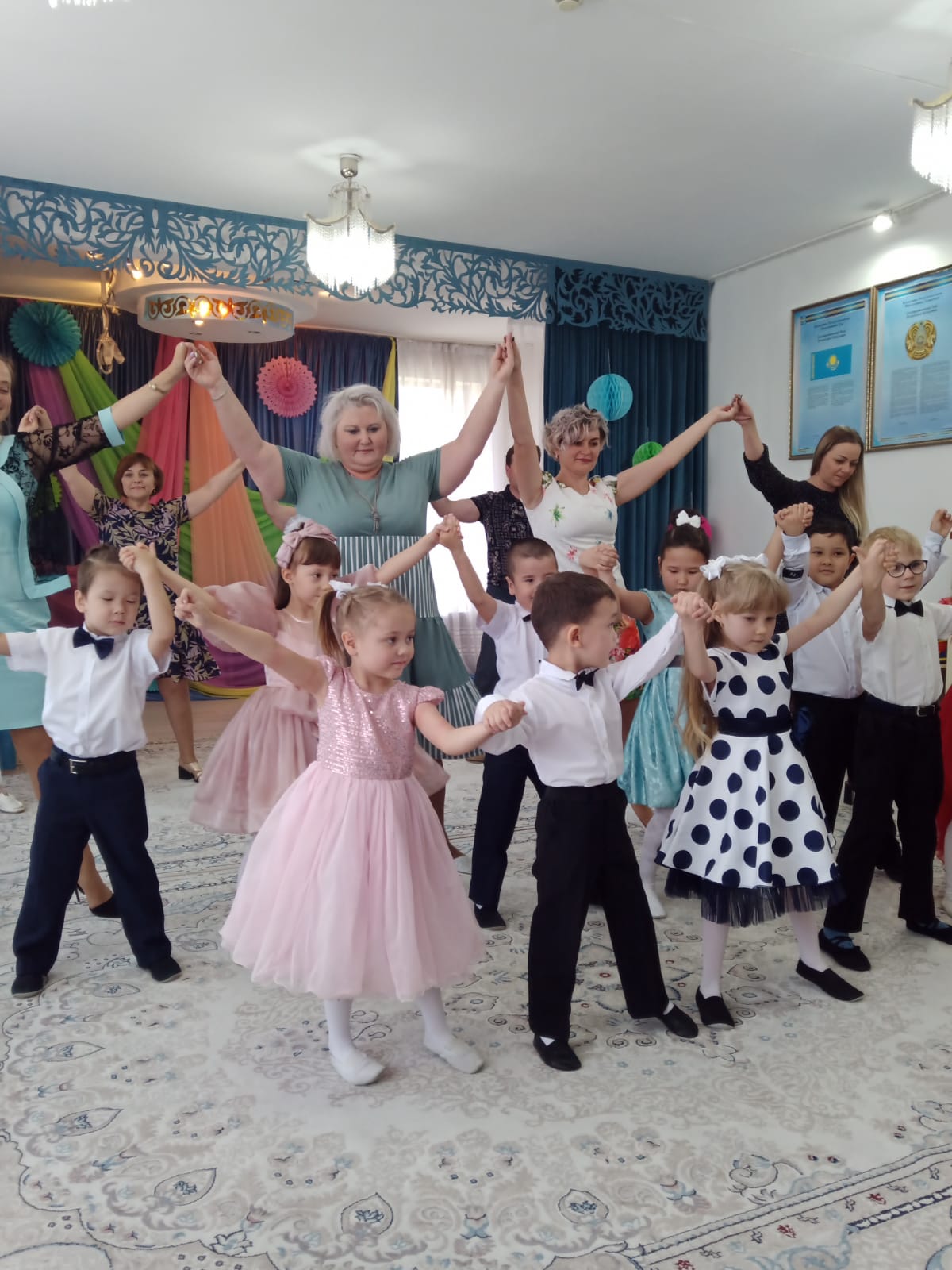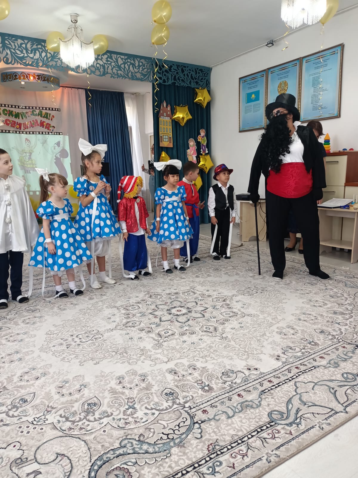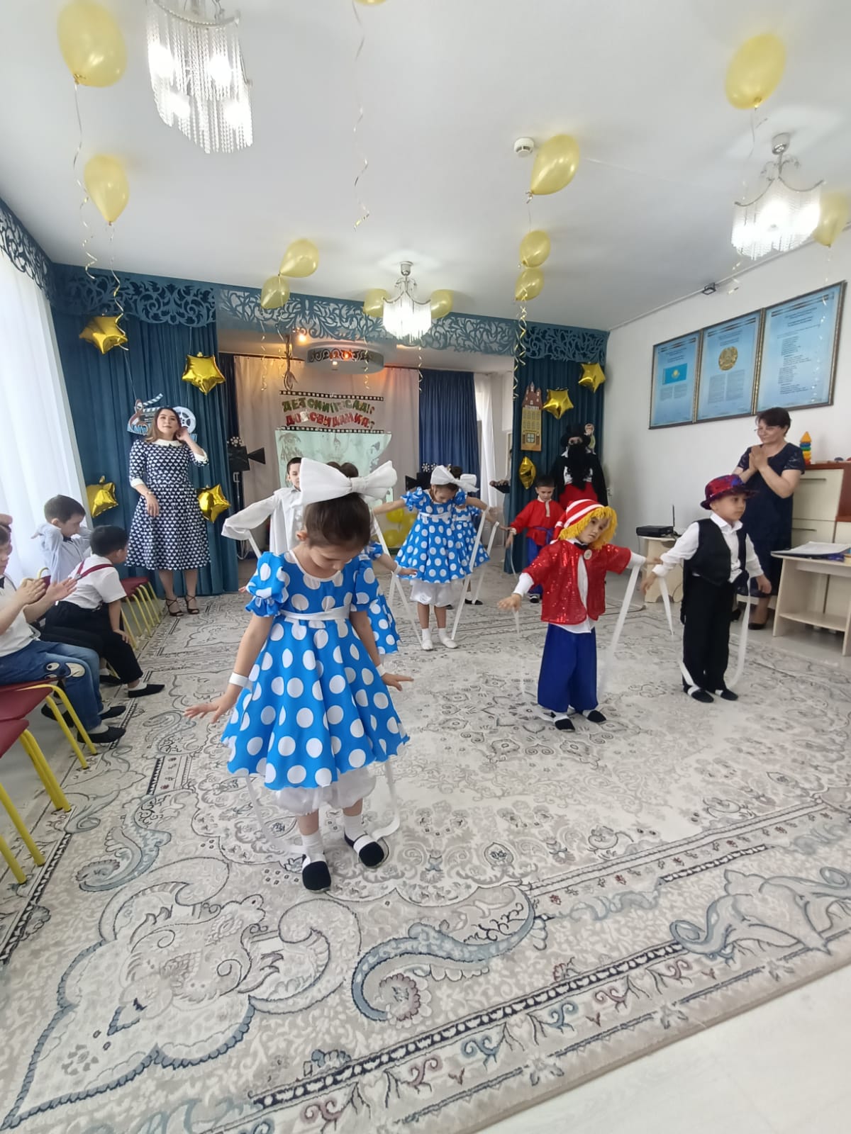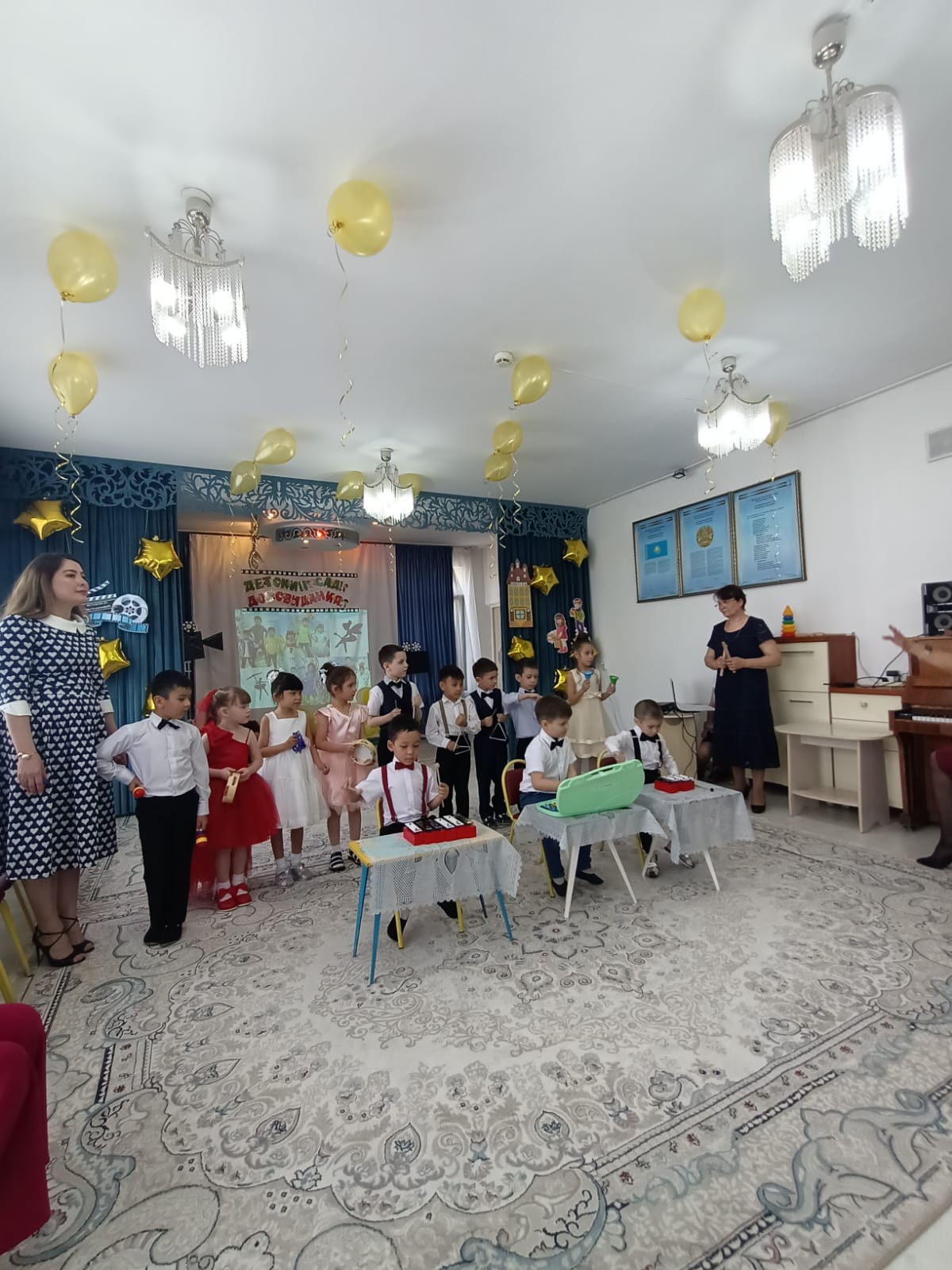 Мерекеде балалар өлең оқып, ән шырқады, ойындар болды және әрине балабақшамен қоштасу вальсі болды. Қонақтардың келуі таңқаларлық болды: кішкентай ханзада, сайқымазақ Бим Бом, Білім Ханшайымы, Фиксиктер және т.б. балалар «балабақшаның» керемет әлеміне тағы бір рет ене алды.