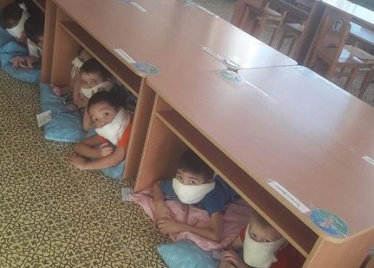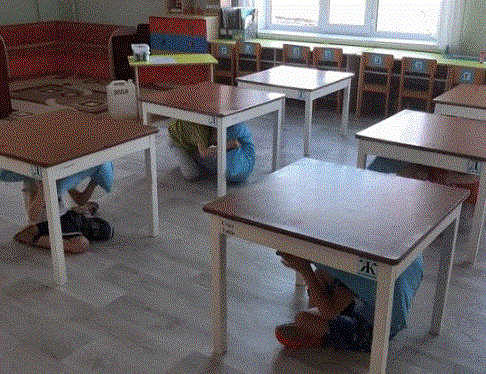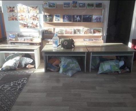 2-3-қабаттың оқушылары мен қызметкерлері есіктің ішкі қабырғасына, бөлменің ішкі бұрышына, үстелдердің астында қауіпсіз орындарды алды.