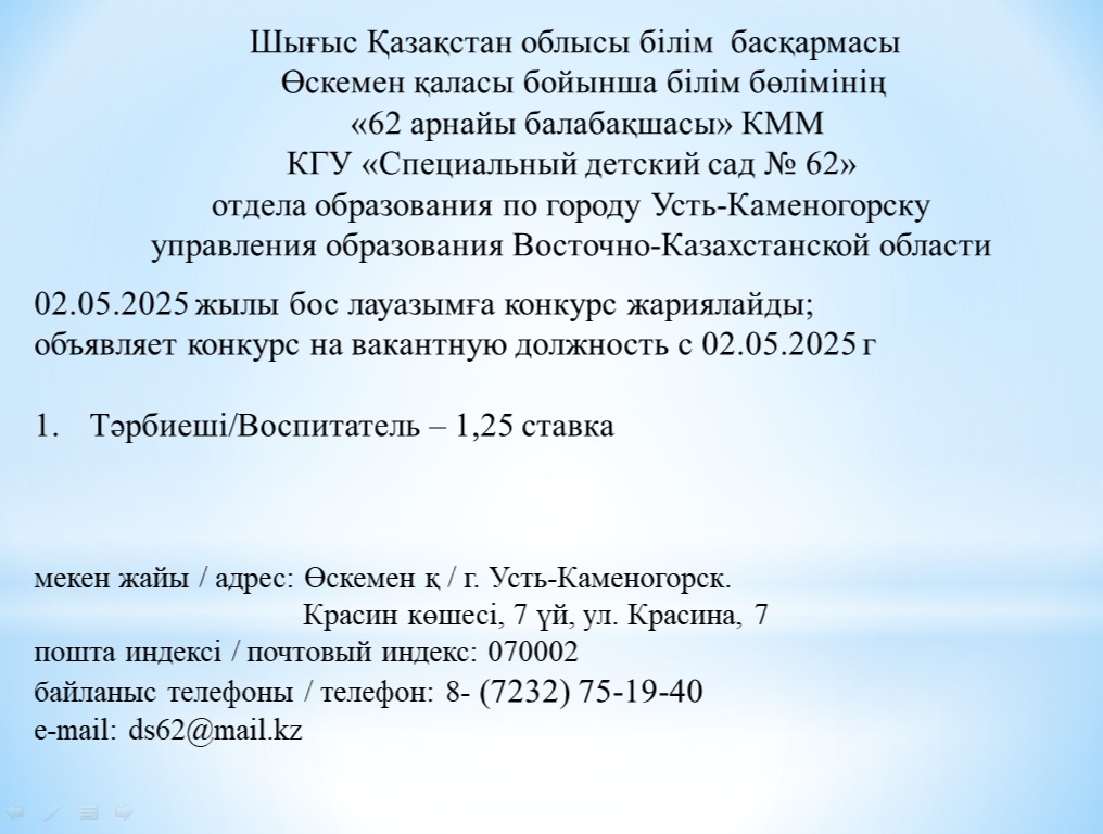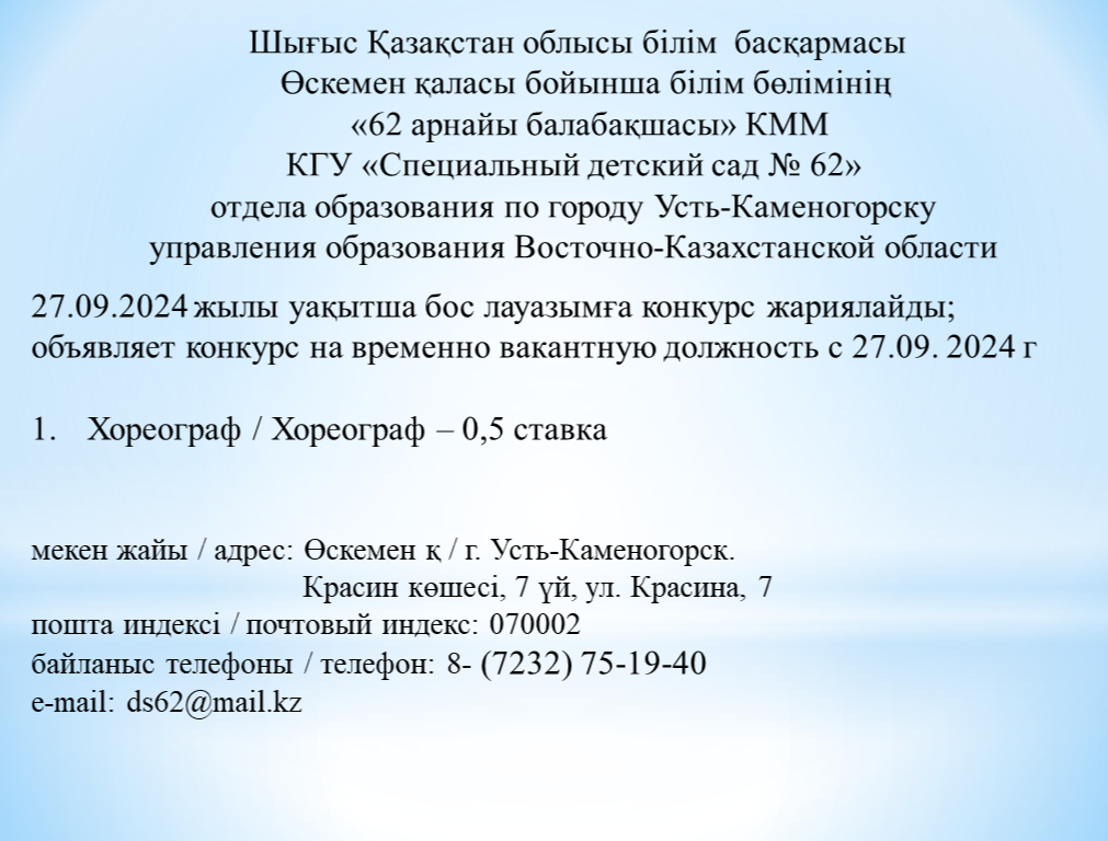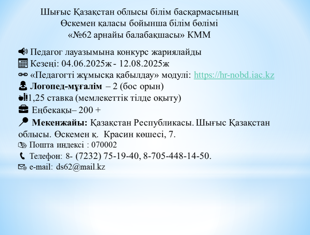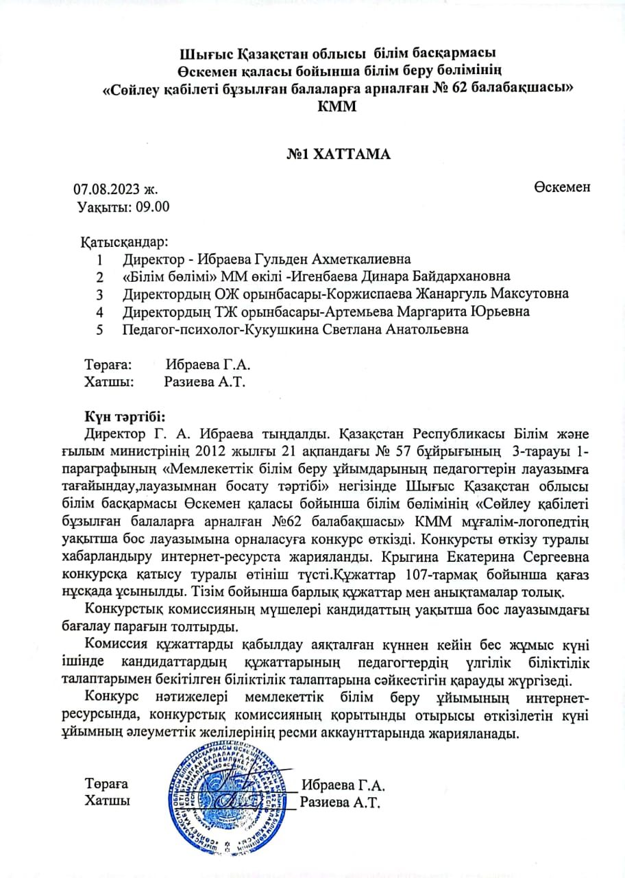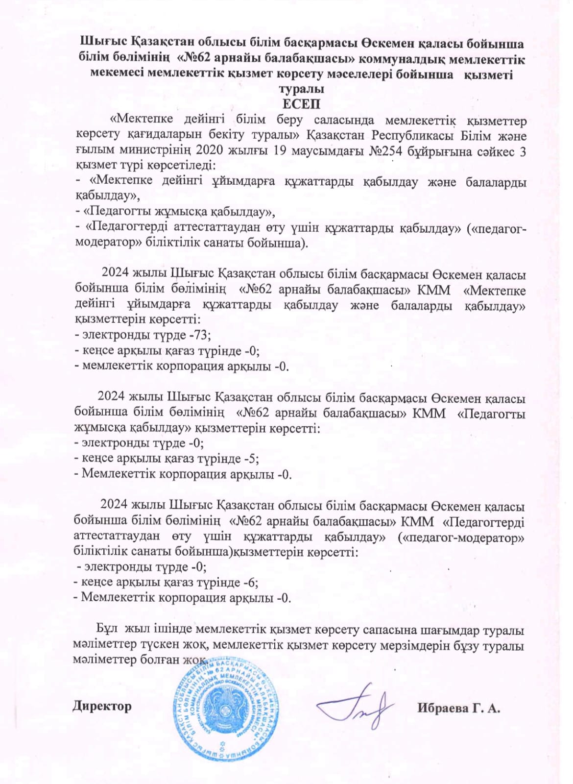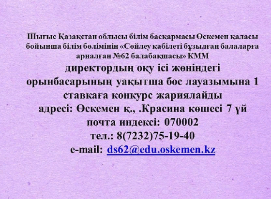 Өскемен қаласы әкімдігінің «Сөйлеу қабілеті бұзылған балаларға арналған № 62 балабақшасы» КММ директорының 2021 жылғы 22 қаңтардағы № 60 бұйрығымен ШҚО білім басқармасы Өскемен қаласы бойынша білім бөлімінің «Сөйлеу қабілеті бұзылған балаларға арналған № 62 балабақшасы» КММ директоры лауазымында жұмысын жалғастырушы болып есептелсін. Директор Ибраева Гульден Ахметкалиевна 2 жоғары білімі бар («Музыка және ән мұғалімі, әдіскер, тәрбиеші», ШҚМУ «Дефектология»), жұмыс өтілі 26 жыл, аталған мекемеде 6 жыл.
