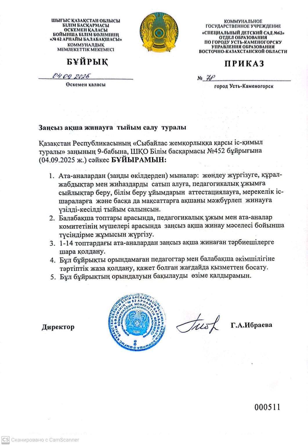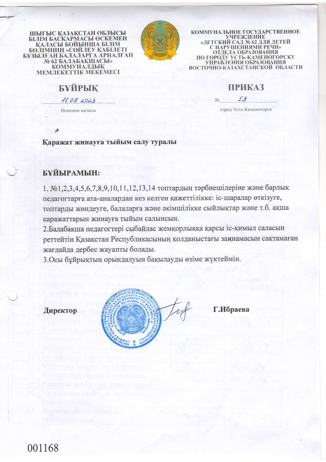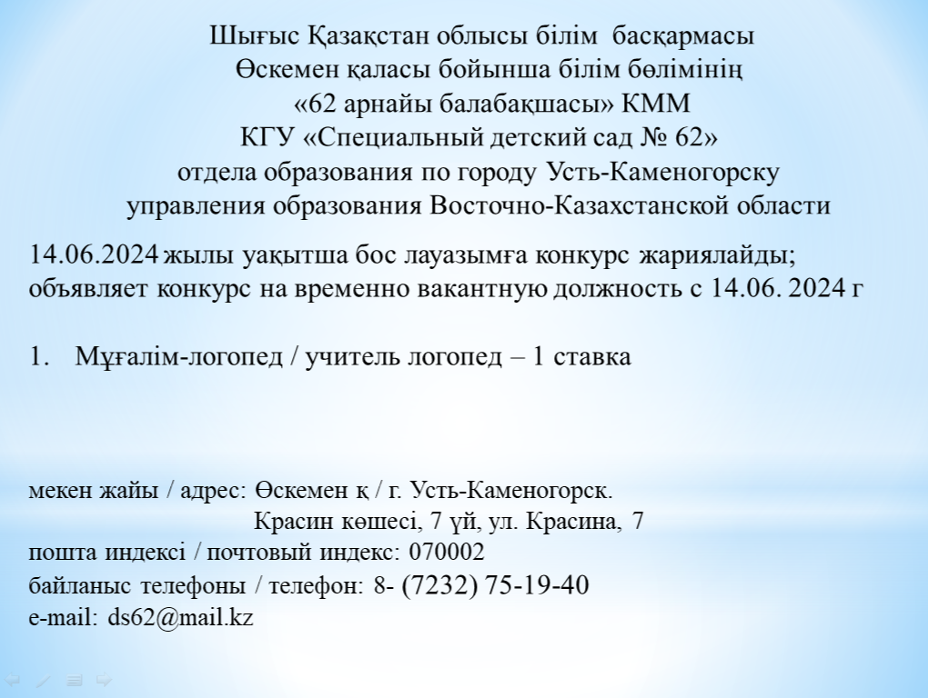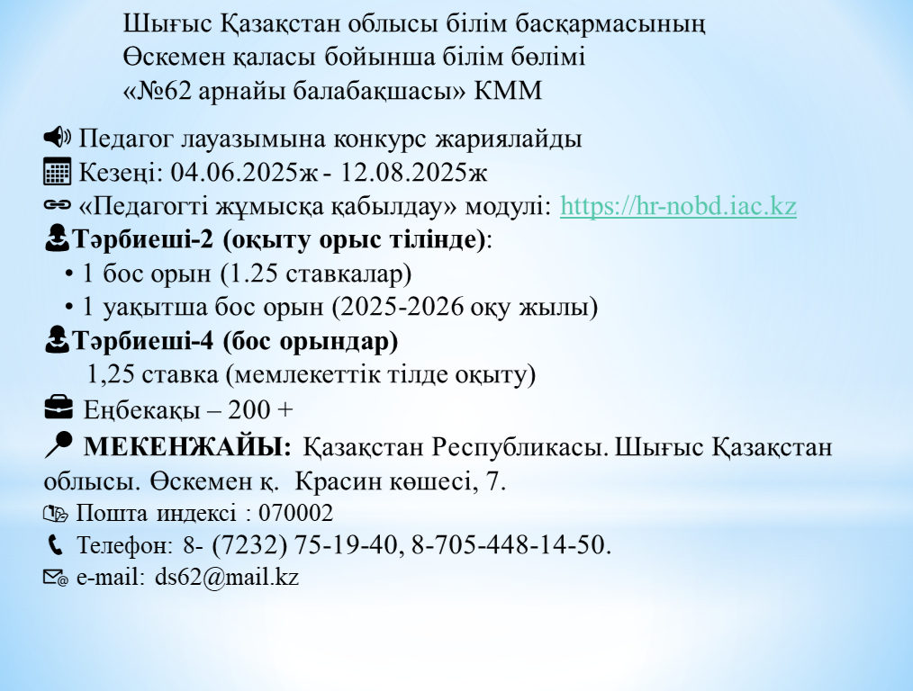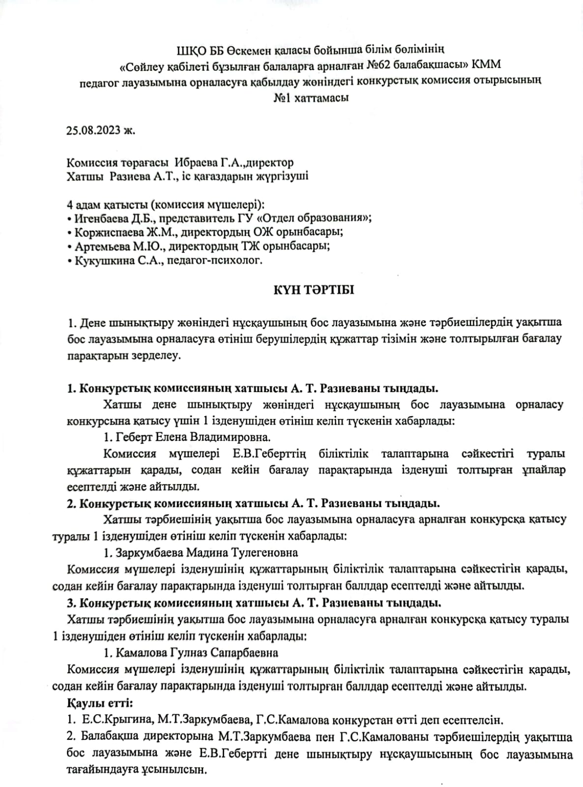 Өскемен қаласы әкімдігінің «Сөйлеу қабілеті бұзылған балаларға арналған № 62 балабақшасы» КММ директорының 2021 жылғы 22 қаңтардағы № 60 бұйрығымен ШҚО білім басқармасы Өскемен қаласы бойынша білім бөлімінің «Сөйлеу қабілеті бұзылған балаларға арналған № 62 балабақшасы» КММ директоры лауазымында жұмысын жалғастырушы болып есептелсін. Директор Ибраева Гульден Ахметкалиевна 2 жоғары білімі бар («Музыка және ән мұғалімі, әдіскер, тәрбиеші», ШҚМУ «Дефектология»), жұмыс өтілі 26 жыл, аталған мекемеде 6 жыл.