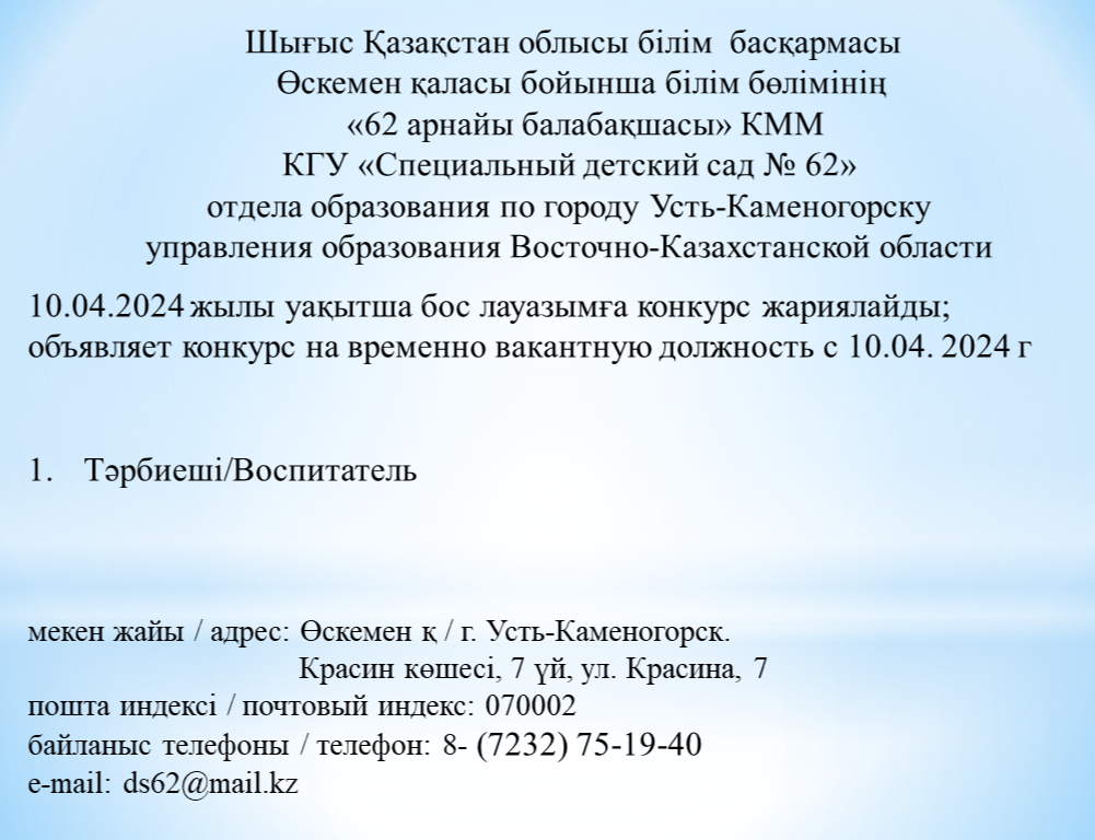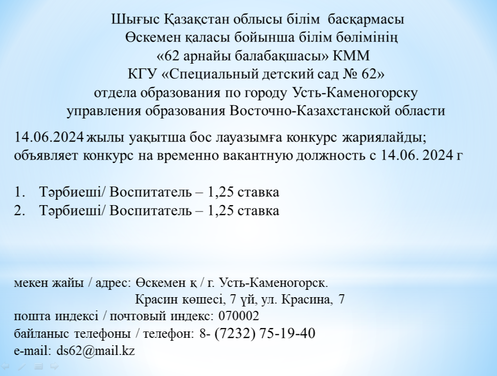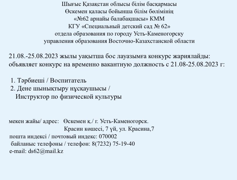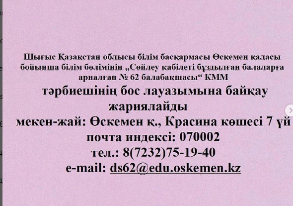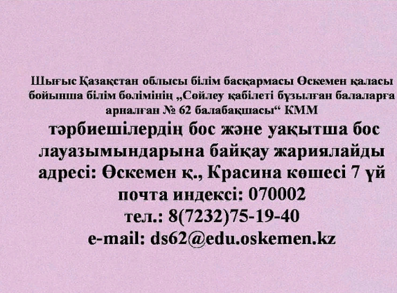 ШҚО білім басқармасы Өскемен қаласы бойынша білім бөлімінің «№62 арнайы балабақшасы» коммуналдық мемлекеттік мекемесі орналасқан жер жері: Қазақстан Республикасы, ШҚО, 070002, Өскемен қаласы, Красин көшесі, №7 үй, телефон: 8-72-32-75-19-40, 87232 22-58-64, электрондық мекенжайы: Бұл электронды пошта мекен-жайы спам-боттардан қорғалған. Көру үшін сіздің браузеріңізде JavaScript қосулы тұруы тиіс.mail.ru