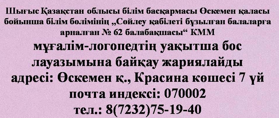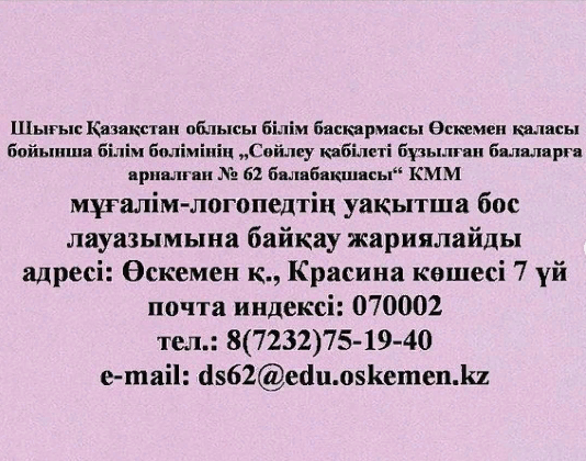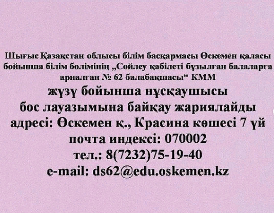 Сөйлеу қабілеті бұзылған балаларға арналған" № 62 мамандандырылған мектеп-балабақша".