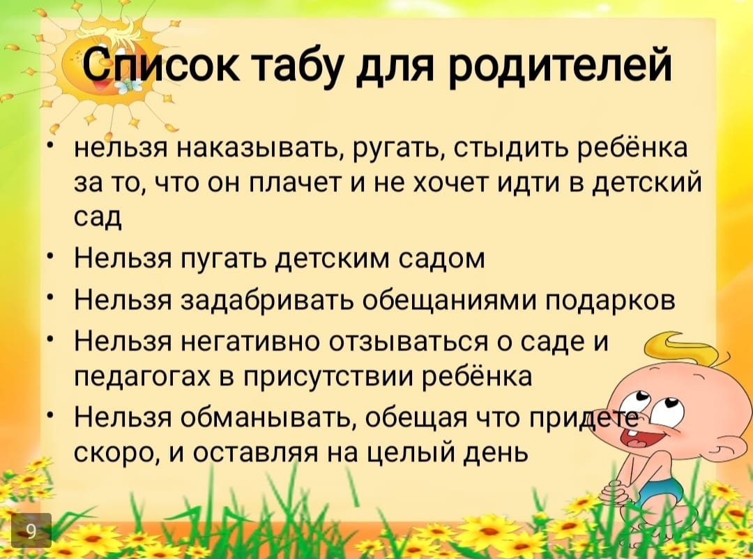 - не пытайтесь подкупить ребёнка, не обещайте и не покупайте ему игрушек за соглашение остаться в детском саду