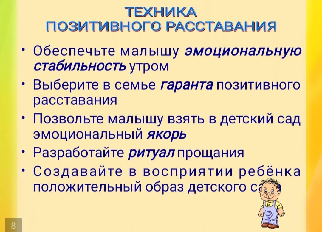 - научитесь прощаться с ребёнком быстро, давая таким образом понять, что вы уверены в нём и его умении справиться с собой. Не затягивайте процесс расставания. Если ребёнок почувствует ваше беспокойство, ему будет труднее успокоиться