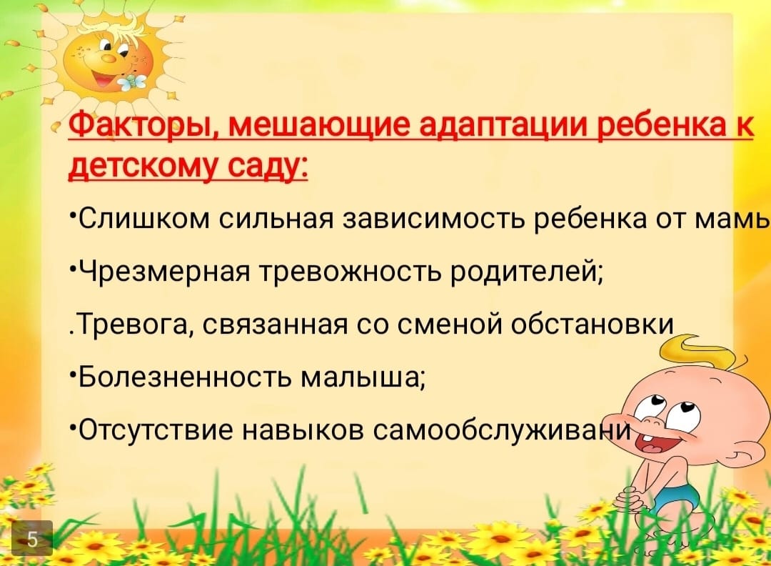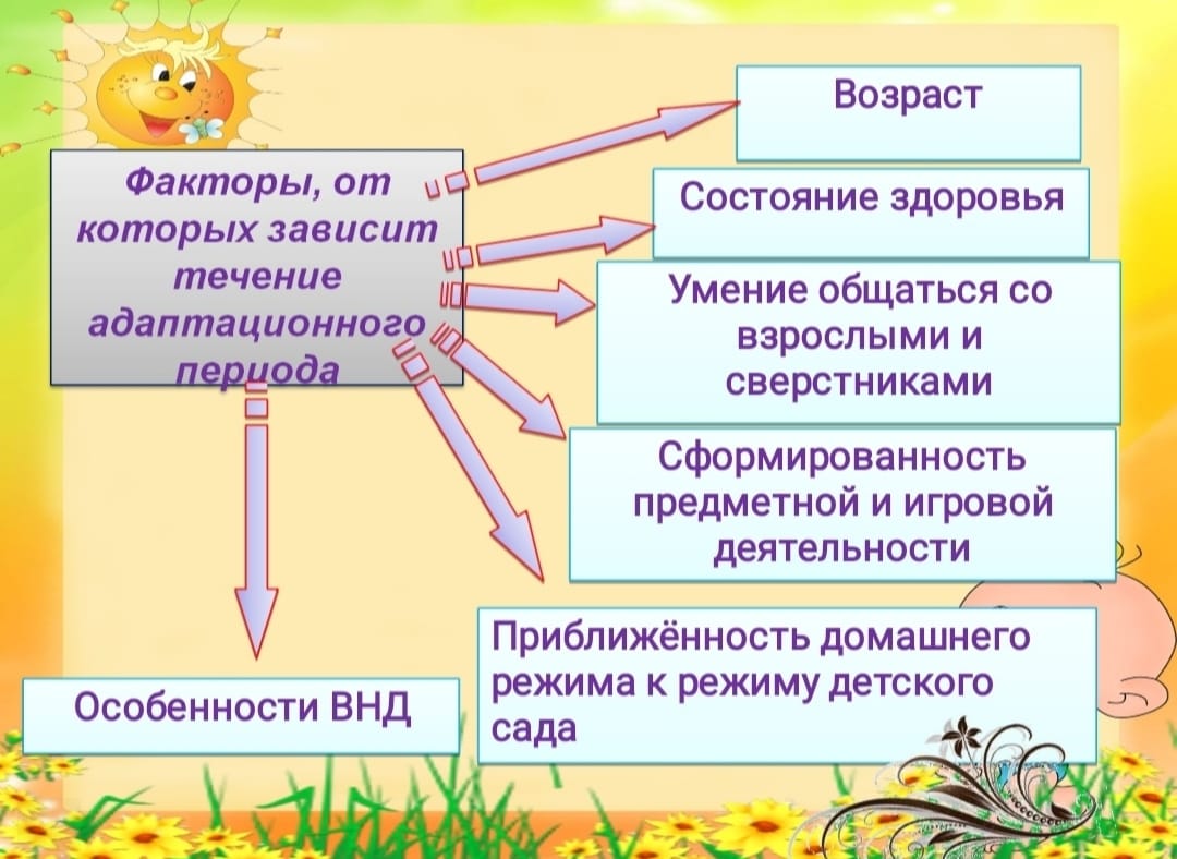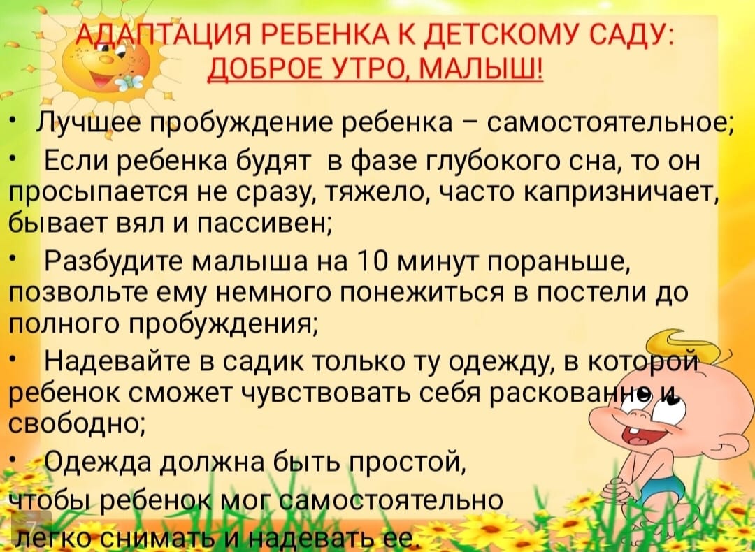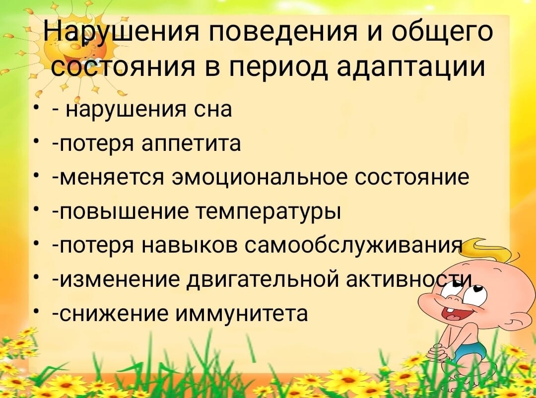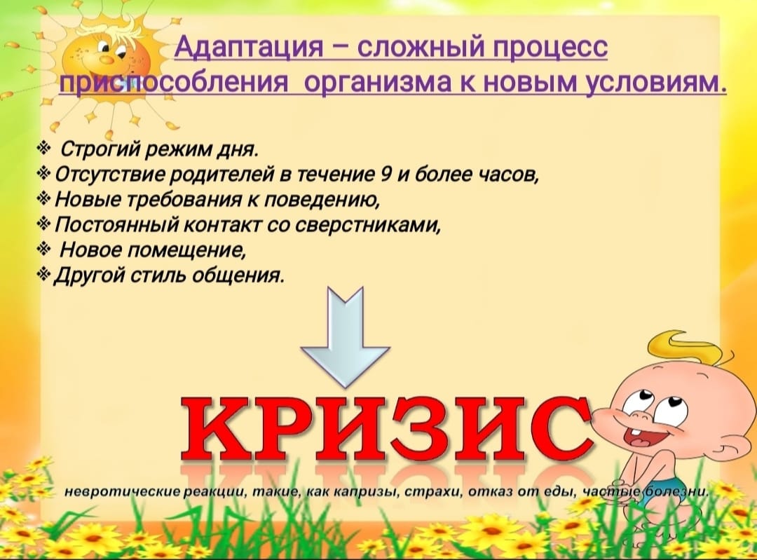 питания, встречи с новыми детьми и взрослыми, разлукой с родителями. Ребёнку необходимо приспособиться к новым условиям жизни. Не все дети одинаково хорошо с этим справляются.