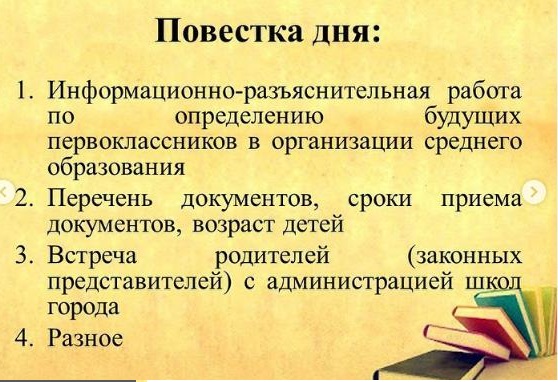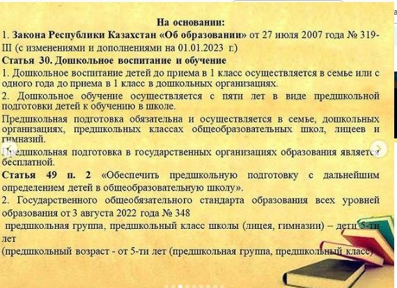 Основываясь на «Закон об образовании Республики Казахстан», Типовые правила приема в организации среднего образования, Стандарт государственной услуги до родителей будущих первоклассников были доведены сведения о том, что организации образования, реализующие общеобразовательные учебные программы начального образования, обеспечивают прием в первый класс детей шести лет и детей, которым в текущем календарном году исполняется шесть лет, с обеспечением доступа всех детей, проживающих на территории обслуживания организации образования, независимо от уровня подготовки.