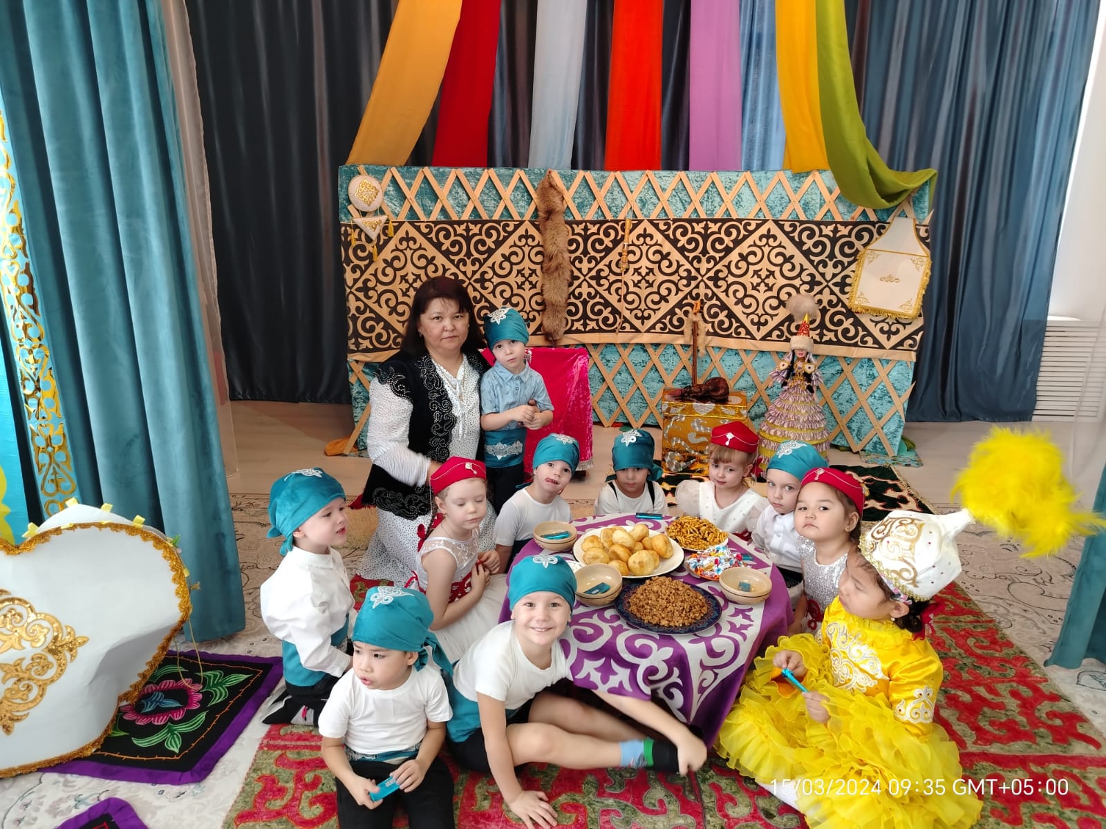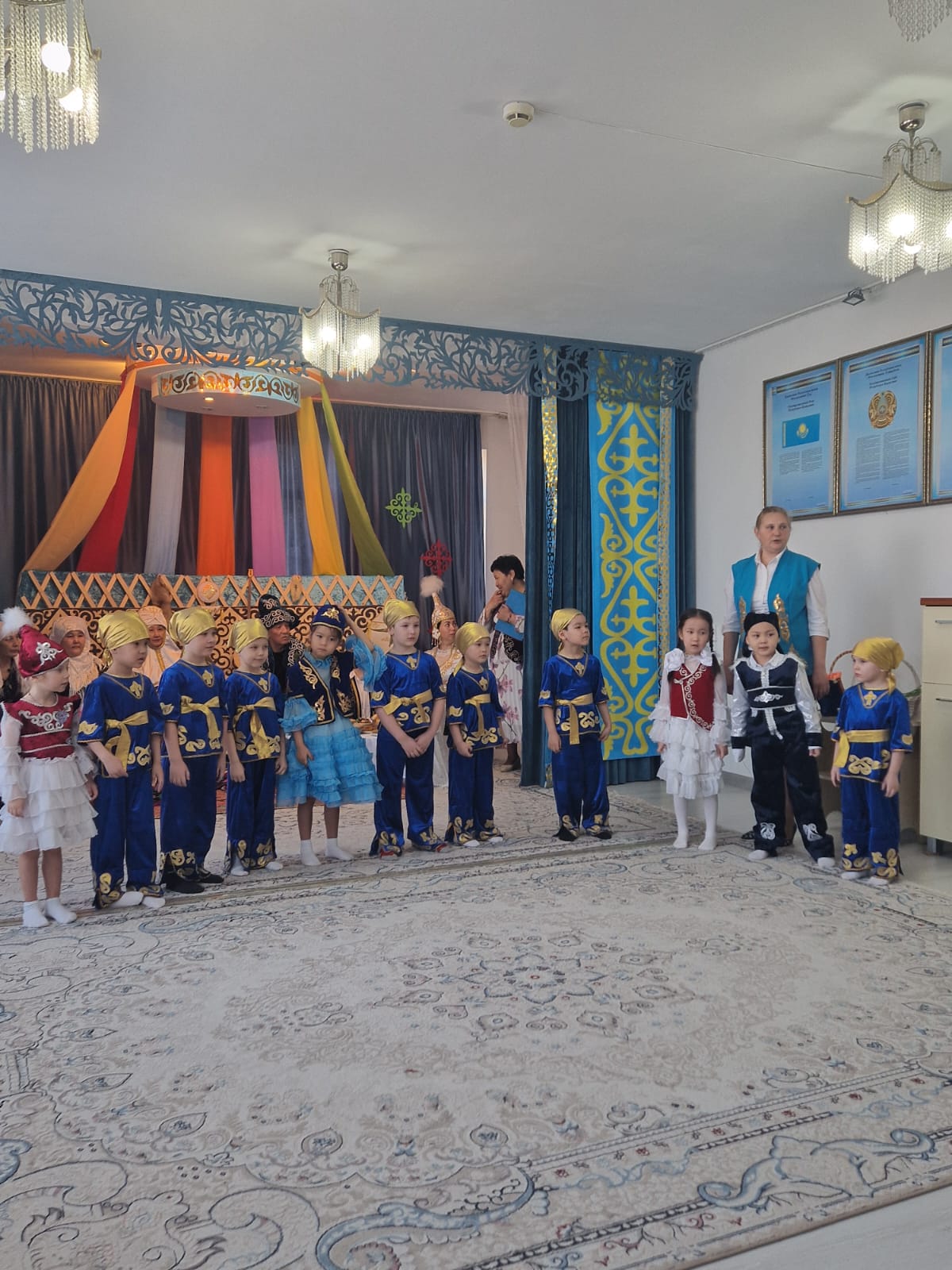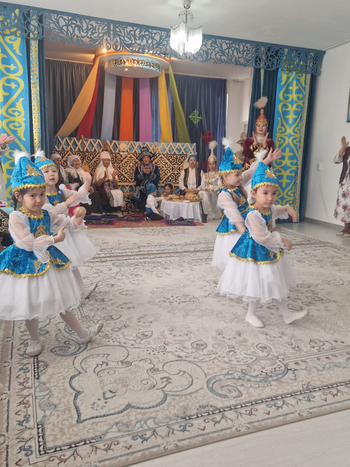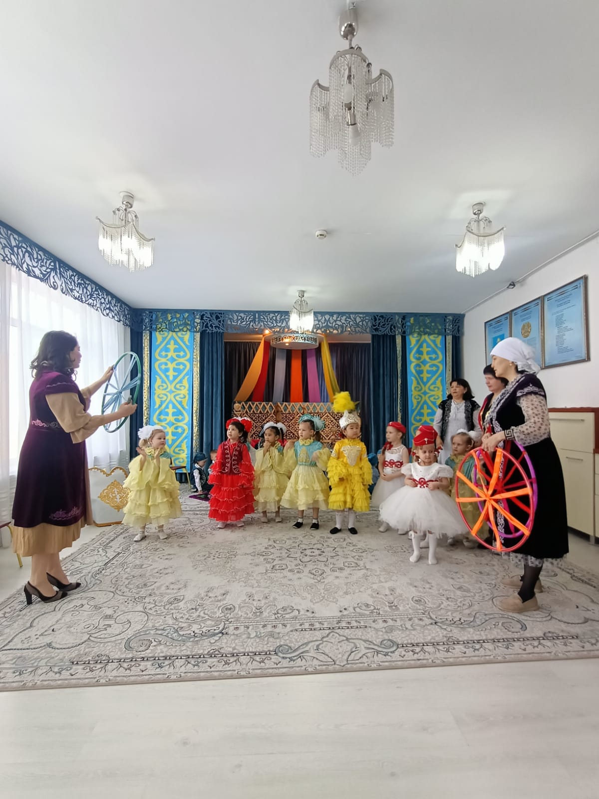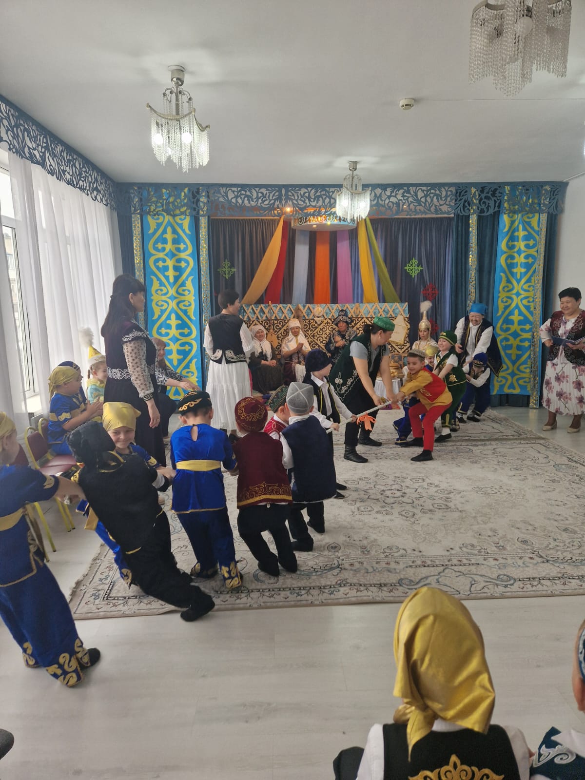 Наурыз-праздник весны, равноденствия, обновления природы. Наурыз-начало года. Наурыз для стран Востока – это праздник единства, мира, труда, весны, добра, счастья. Следуя традициям казахского народа на мероприятии звучали песни, стихи и танцы в исполнении воспитанников. Были проведены обряды «Шаш өру дәстүрі», «Бесікке салу» «Тұсау кесу» с соблюдением всех правил. Проводились национальные игры «Тенге алу», «Арқан тарту», «Гүл теру». В дни празднования Наурыза на мероприятии был накрыт дастархан, который символизировал достаток и изобилие в доме. Соблюдая традиции, на мероприятии звучали бата (благословения) от Кыдыр ата. В гостях на данном мероприятии были родители, сотрудники детского сада