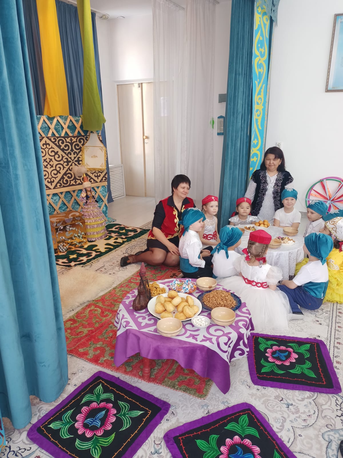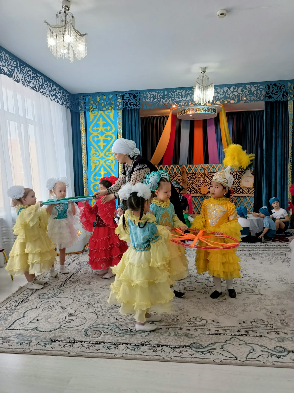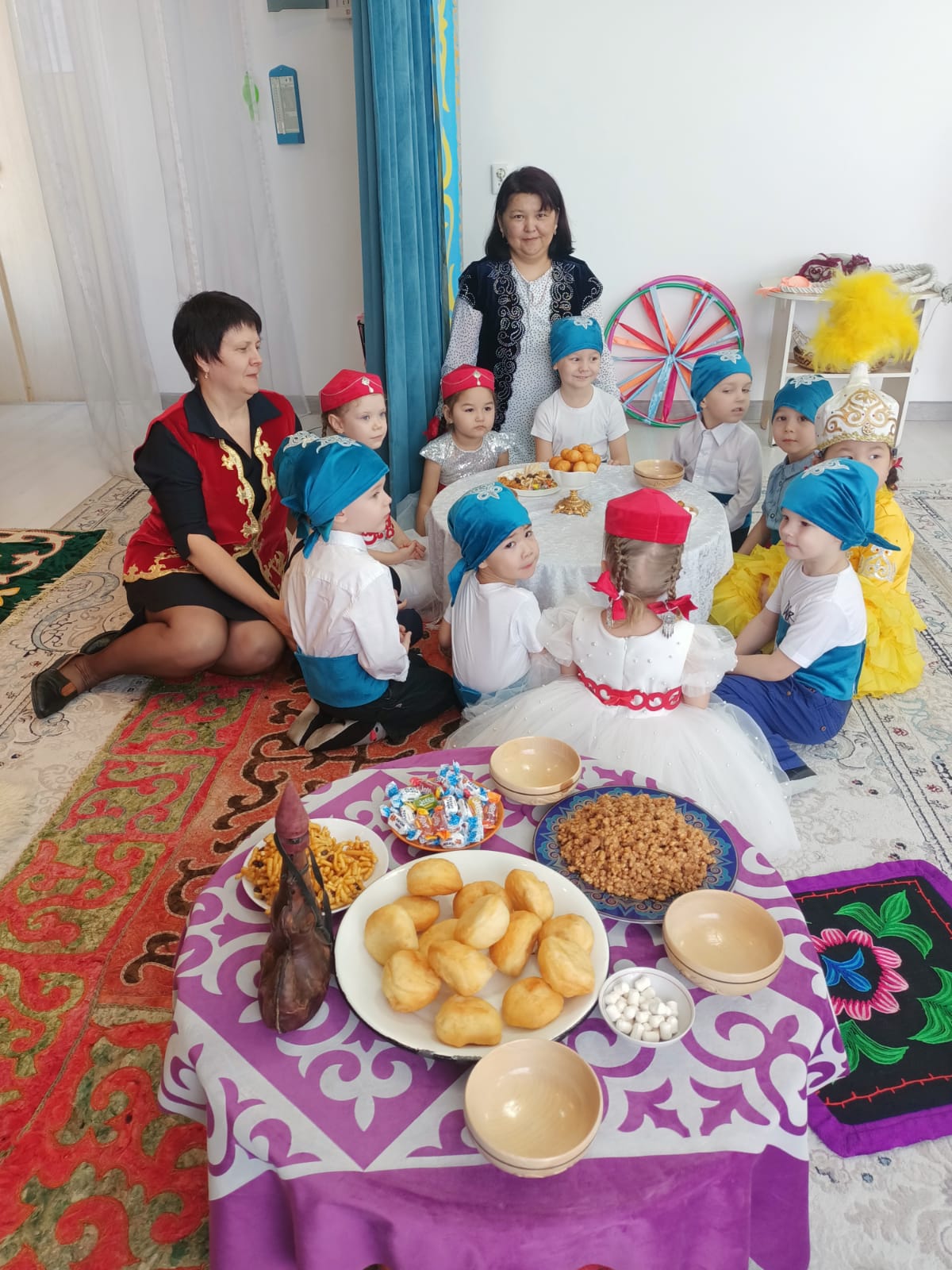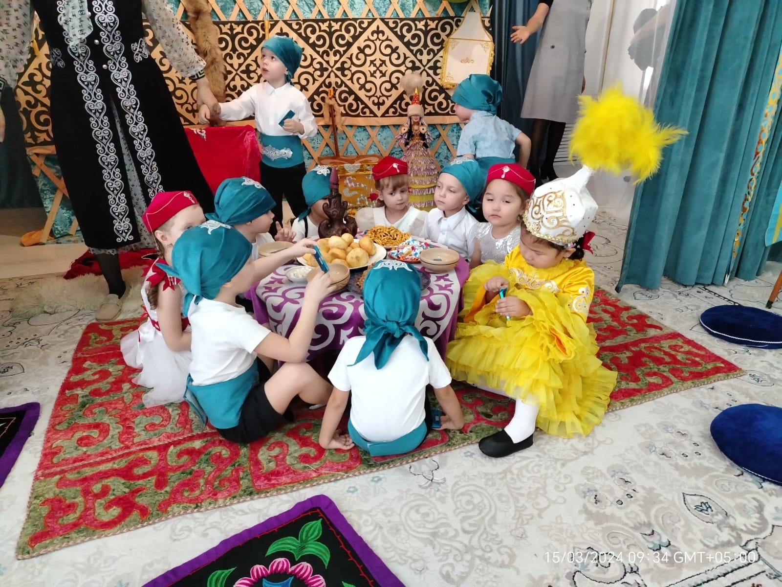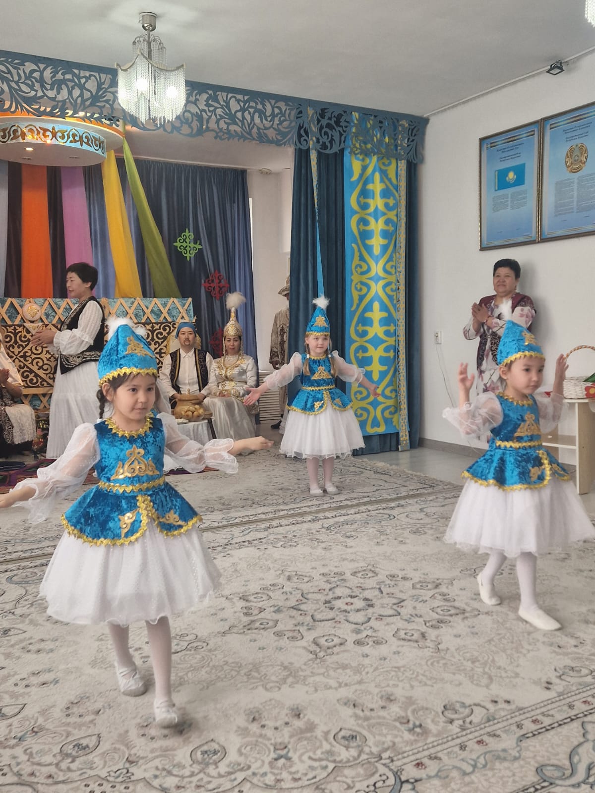 Наурыз-праздник весны, равноденствия, обновления природы. Наурыз-начало года. Наурыз для стран Востока – это праздник единства, мира, труда, весны, добра, счастья. Следуя традициям казахского народа на мероприятии звучали песни, стихи и танцы в исполнении воспитанников. Были проведены обряды «Шаш өру дәстүрі», «Бесікке салу» «Тұсау кесу» с соблюдением всех правил. Проводились национальные игры «Тенге алу», «Арқан тарту», «Гүл теру». В дни празднования Наурыза на мероприятии был накрыт дастархан, который символизировал достаток и изобилие в доме. Соблюдая традиции, на мероприятии звучали бата (благословения) от Кыдыр ата. В гостях на данном мероприятии были родители, сотрудники детского сада