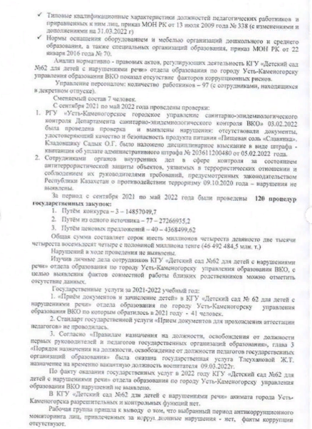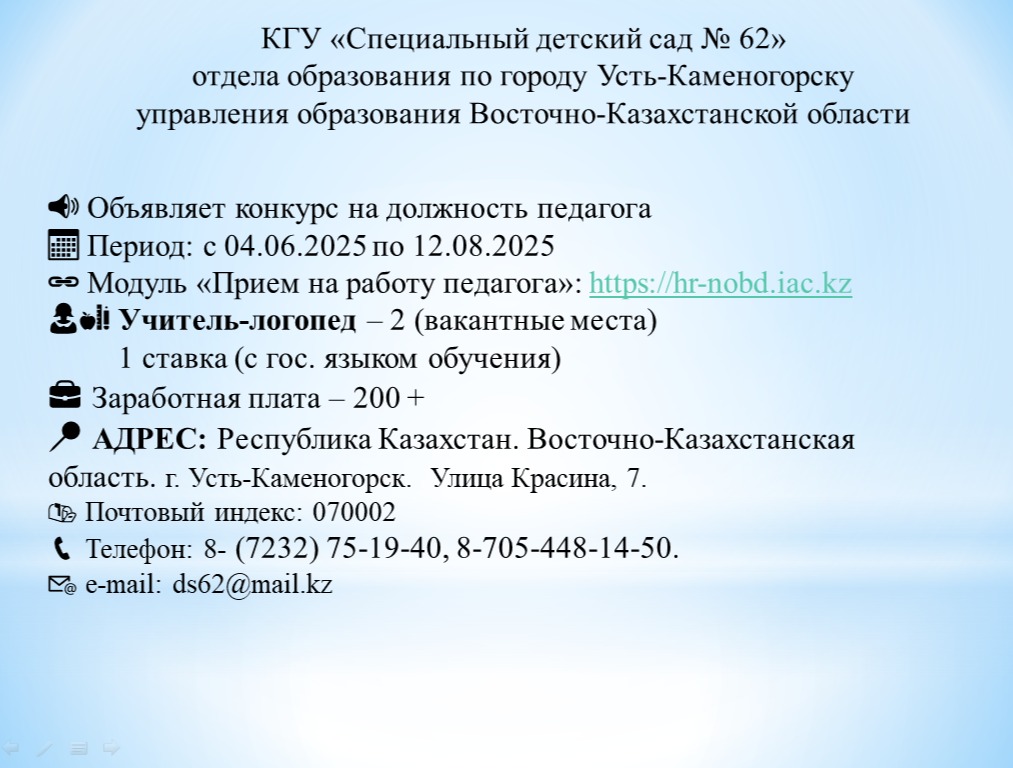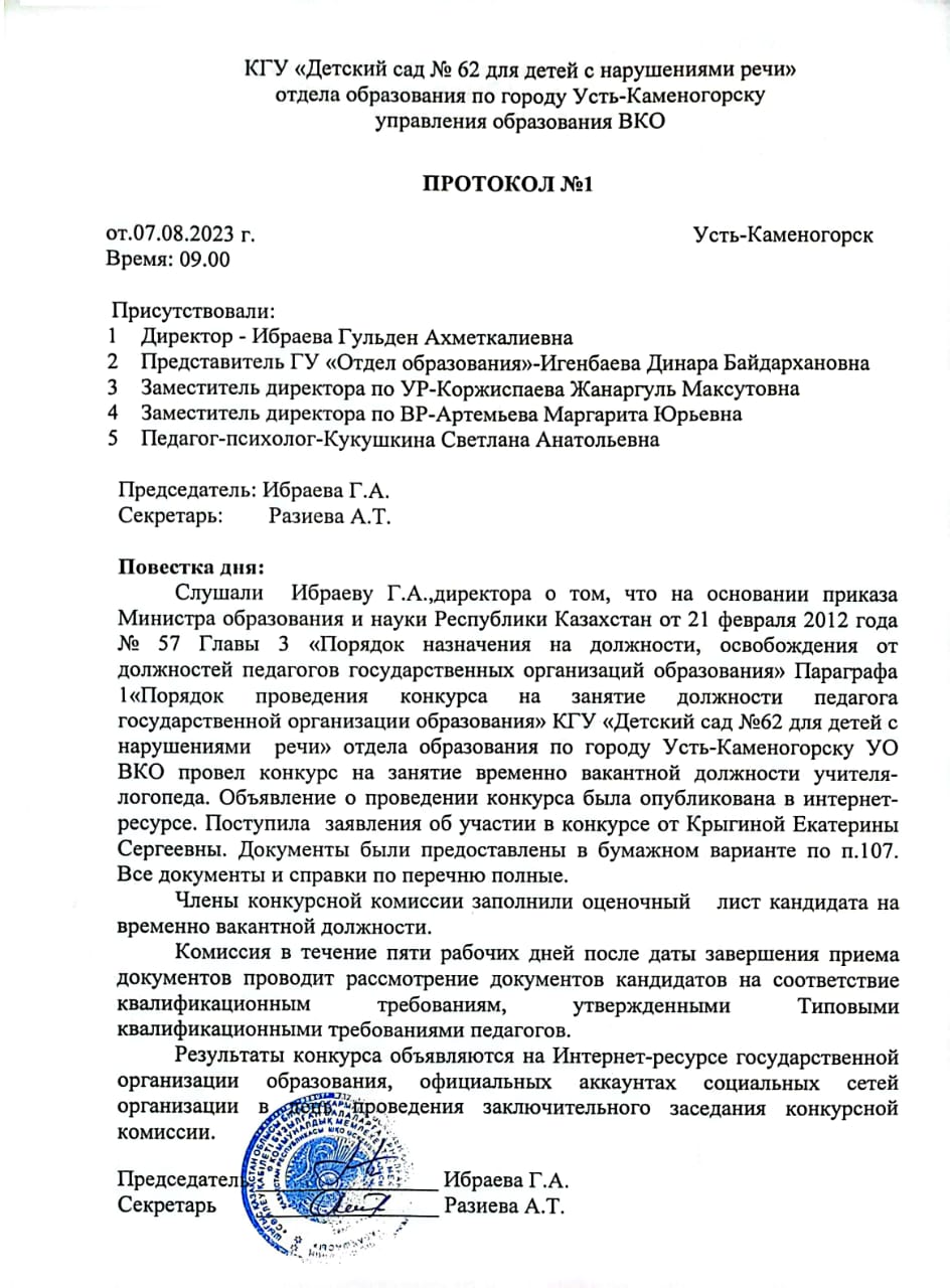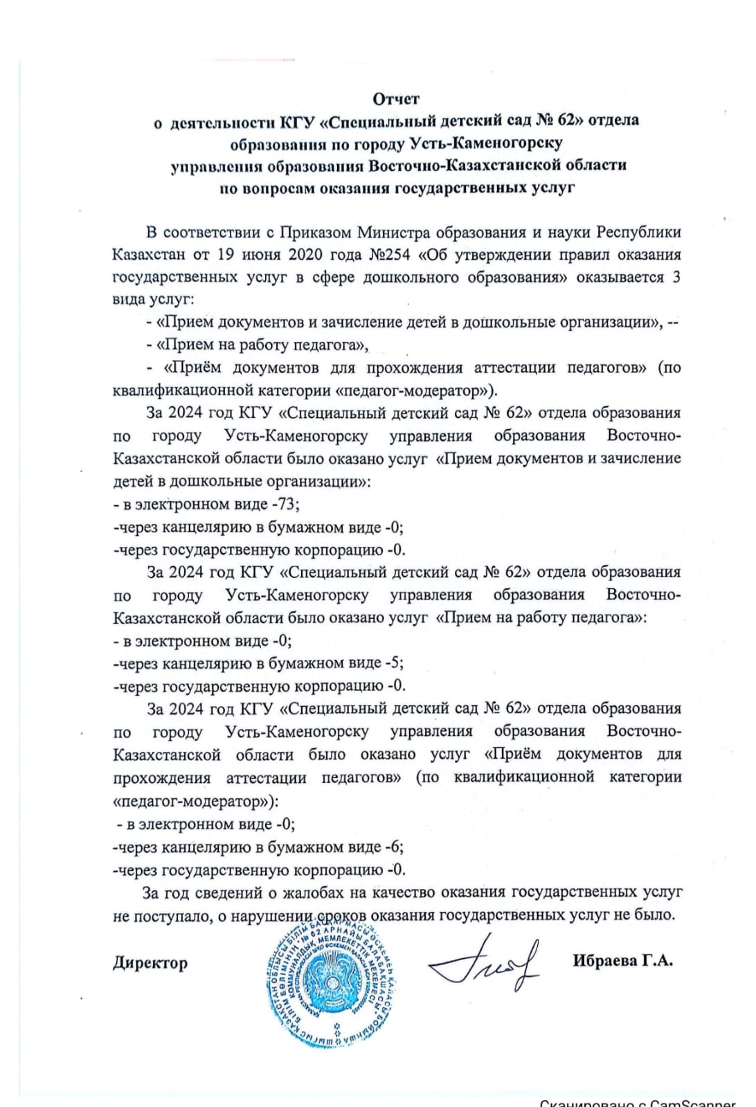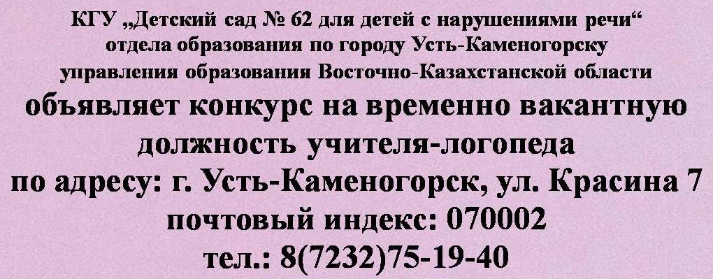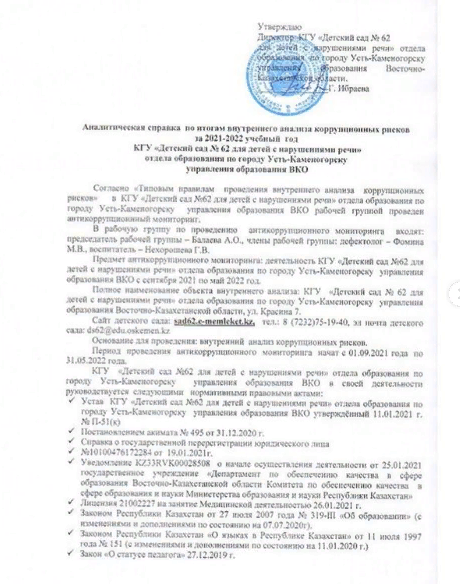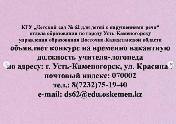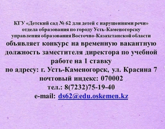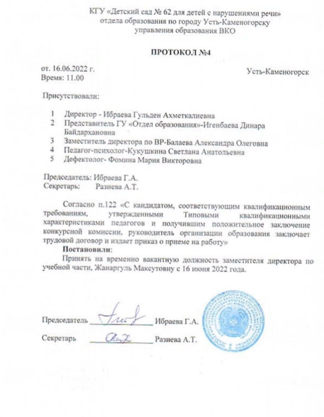 Приказом № 60 от 22 января 2021 года директора КГУ «Детский сад № 62 для детей с напрушениями речи» акимата города Усть-Каменогорска считать продолжающей работать в должности директора КГУ «Детский сад № 62 для детей с нарушениями» речи отдела образования по городу Усть – Каменогорску управления образования ВКО. Директор Ибраева Гульден Ахметкалиевна имеет 2 высших образования (УКПИ «Учитель музыки и пения, методист, воспитатель», ВКГУ «Дефектология»), стаж работы 26 лет, в данном учреждении 6 лет.