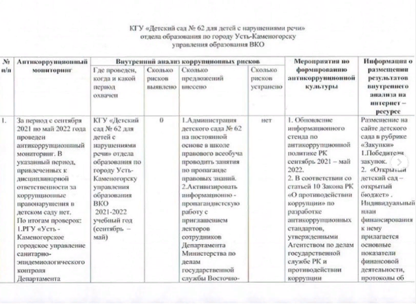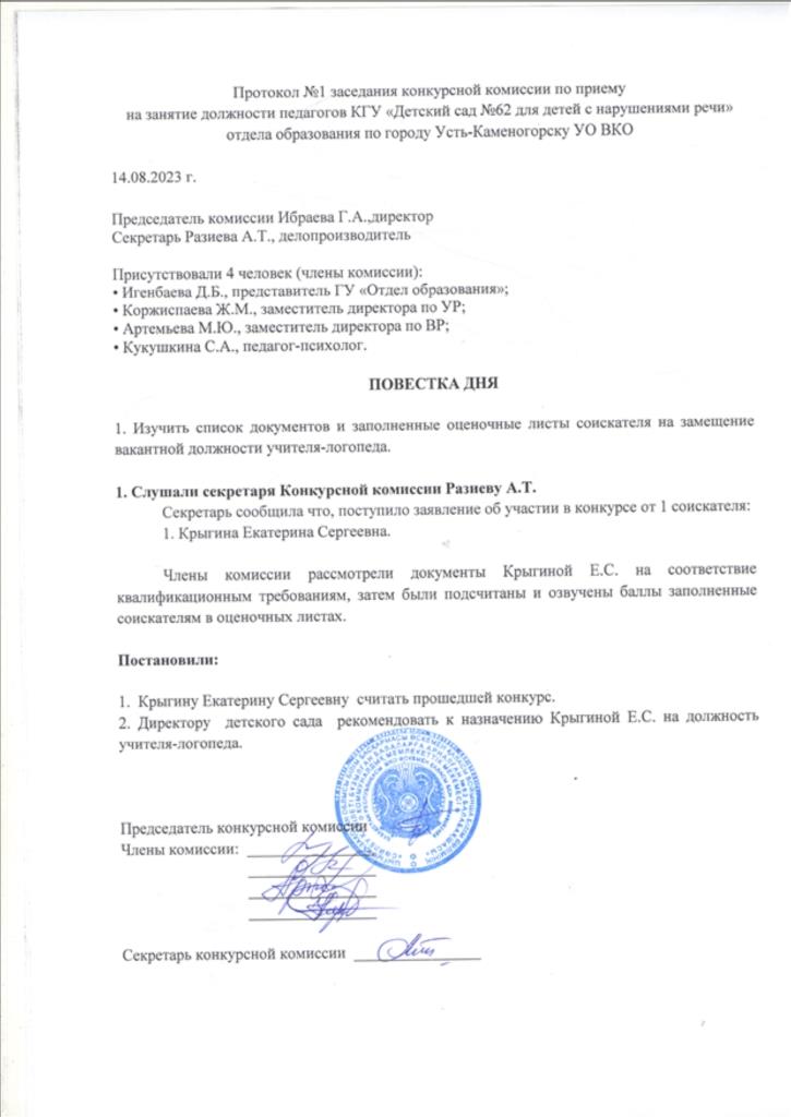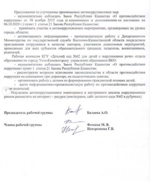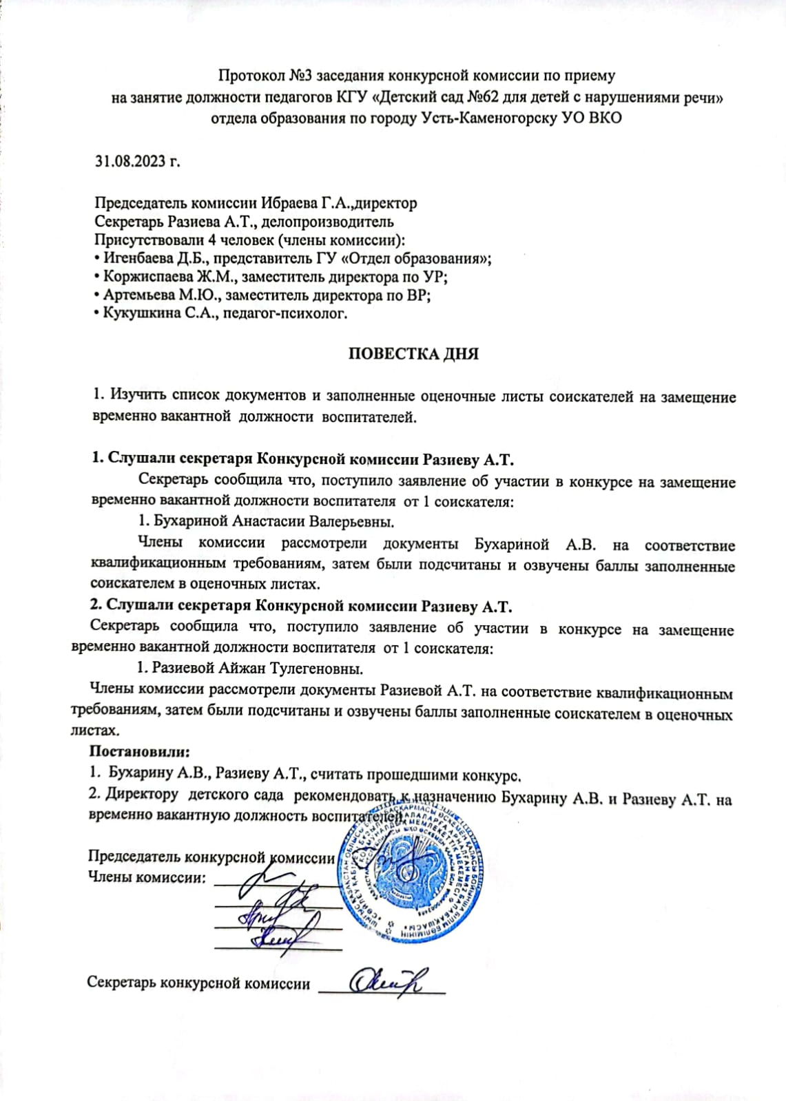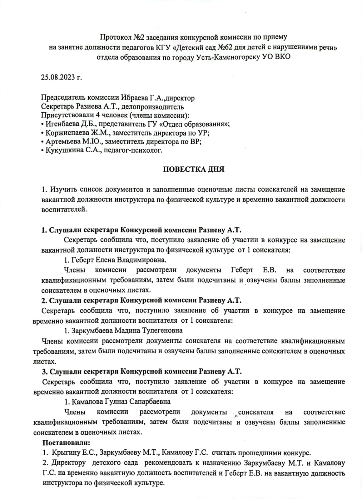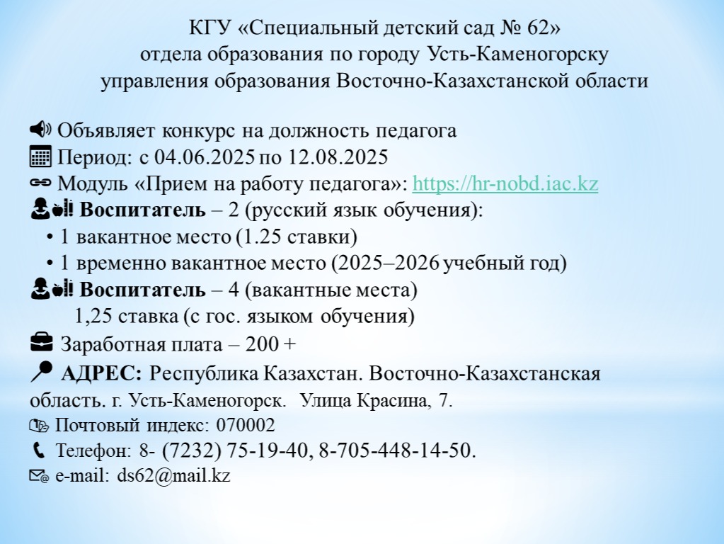 Приказом № 60 от 22 января 2021 года директора КГУ «Детский сад № 62 для детей с напрушениями речи» акимата города Усть-Каменогорска считать продолжающей работать в должности директора КГУ «Детский сад № 62 для детей с нарушениями» речи отдела образования по городу Усть – Каменогорску управления образования ВКО. Директор Ибраева Гульден Ахметкалиевна имеет 2 высших образования (УКПИ «Учитель музыки и пения, методист, воспитатель», ВКГУ «Дефектология»), стаж работы 26 лет, в данном учреждении 6 лет.