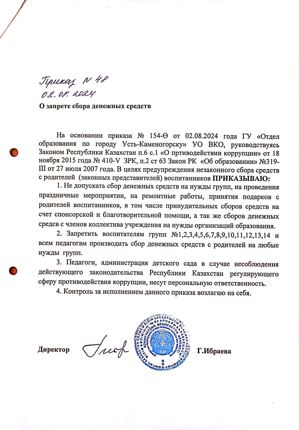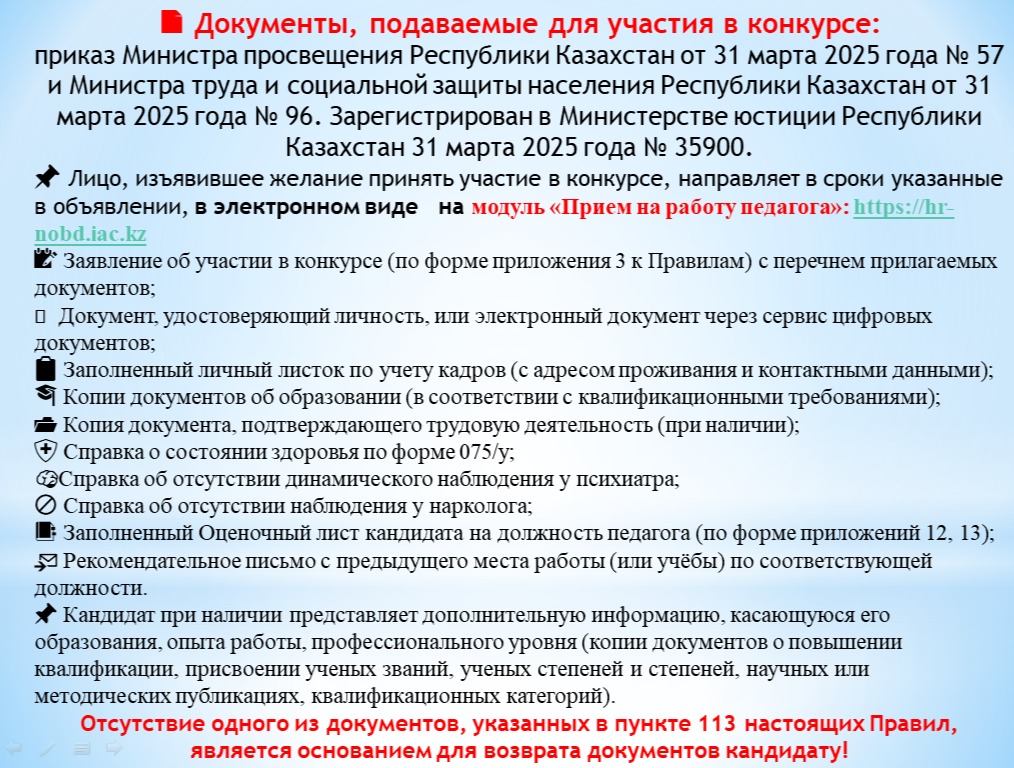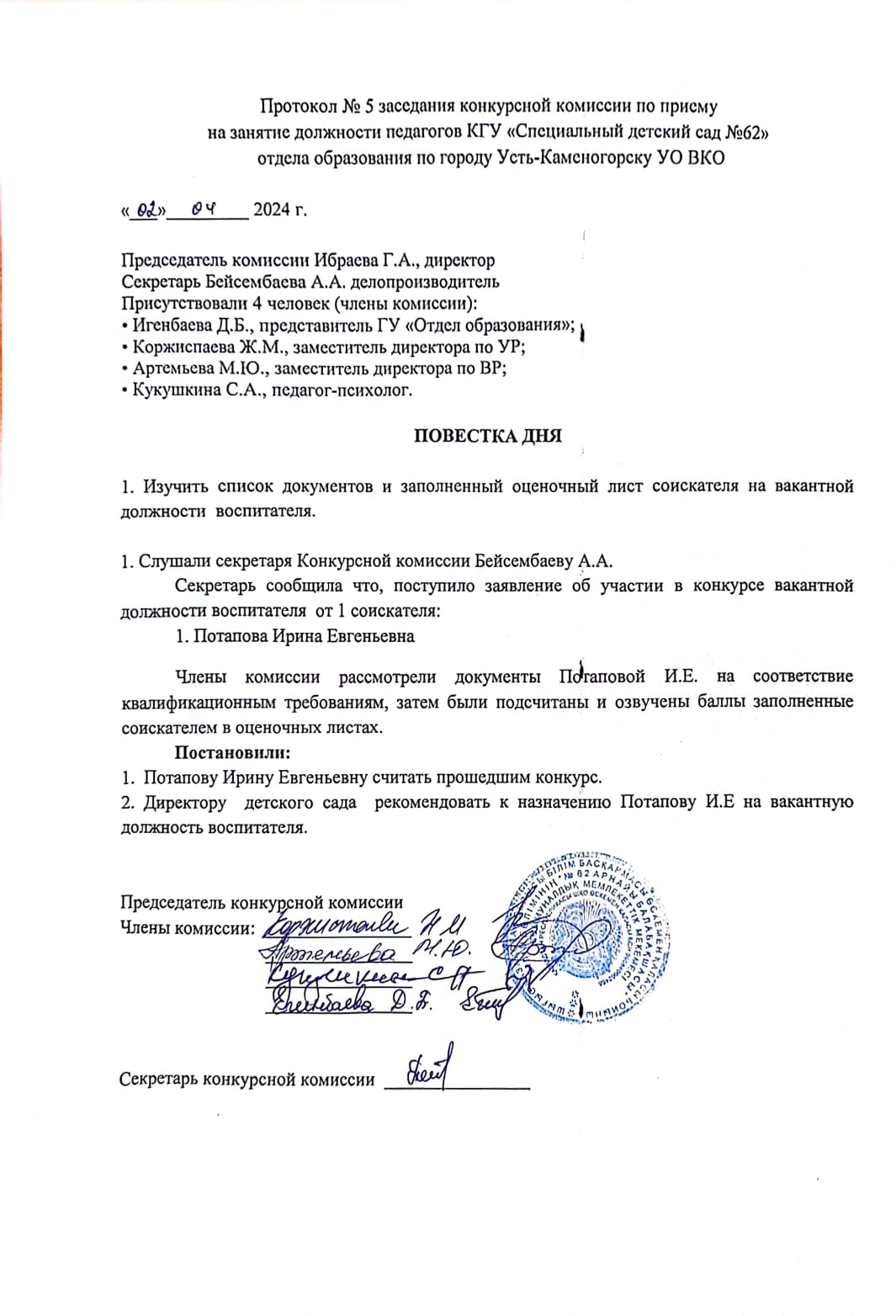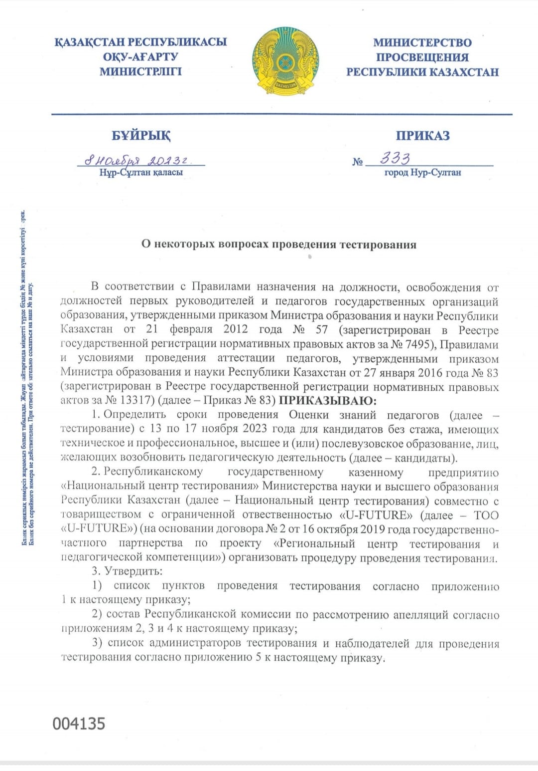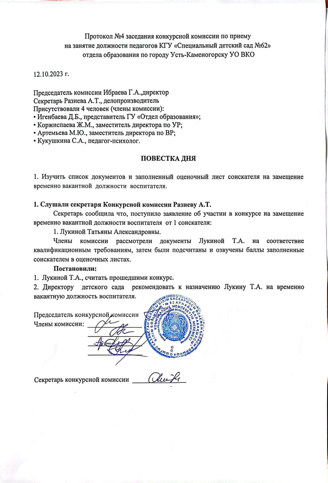 Приказом № 60 от 22 января 2021 года директора КГУ «Детский сад № 62 для детей с напрушениями речи» акимата города Усть-Каменогорска считать продолжающей работать в должности директора КГУ «Детский сад № 62 для детей с нарушениями» речи отдела образования по городу Усть – Каменогорску управления образования ВКО. Директор Ибраева Гульден Ахметкалиевна имеет 2 высших образования (УКПИ «Учитель музыки и пения, методист, воспитатель», ВКГУ «Дефектология»), стаж работы 26 лет, в данном учреждении 6 лет.