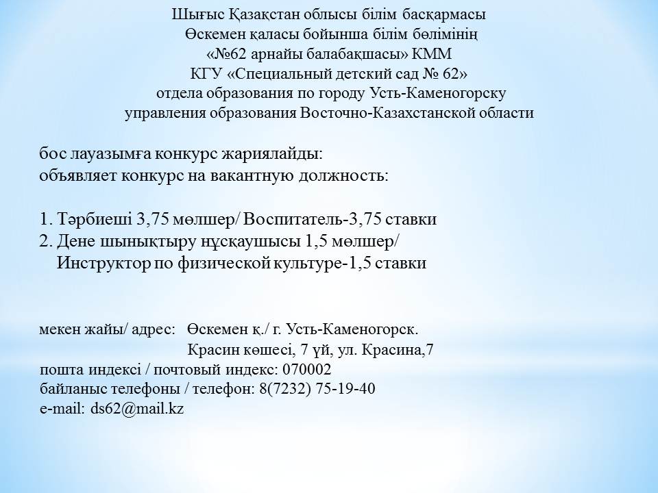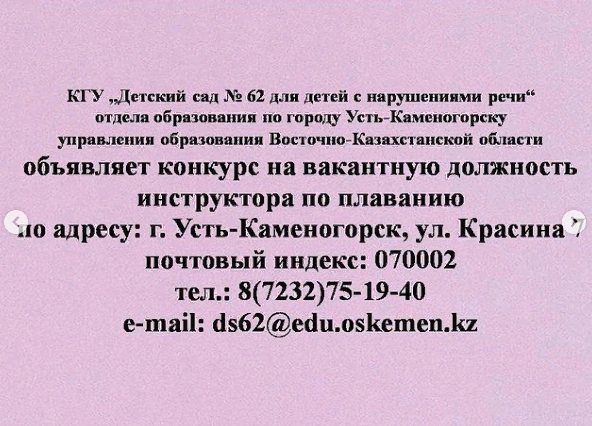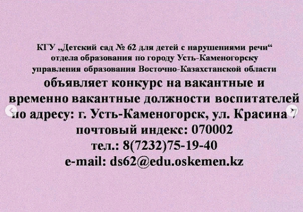 Коммунальное государственное учреждение «Специальный детский сад № 62 для" отдела образования по городу Усть – Каменогорску управления образования ВКО расположен: Республика Казахстан, ВКО, 070002, город Усть-Каменогорск, улица Красина, дом №7, телефон: 8-72-32-75-19-40, 87232 22-58-64, электронный адрес: Адрес электронной почты защищен от спам-ботов. Для просмотра адреса в вашем браузере должен быть включен Javascript.mail.kz . Проектная мощность составляет – 168 мест. Обучение ведется на русском языке, казахском языке для детей дошкольного возраста от 3 до 6 лет.